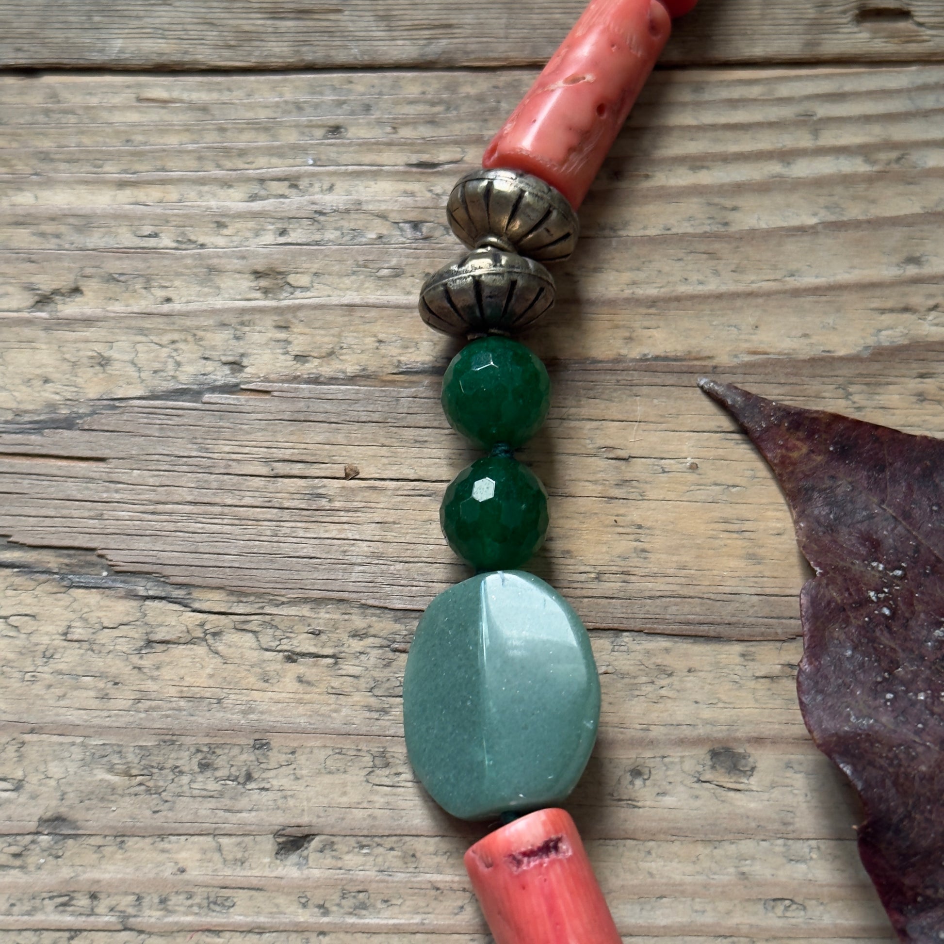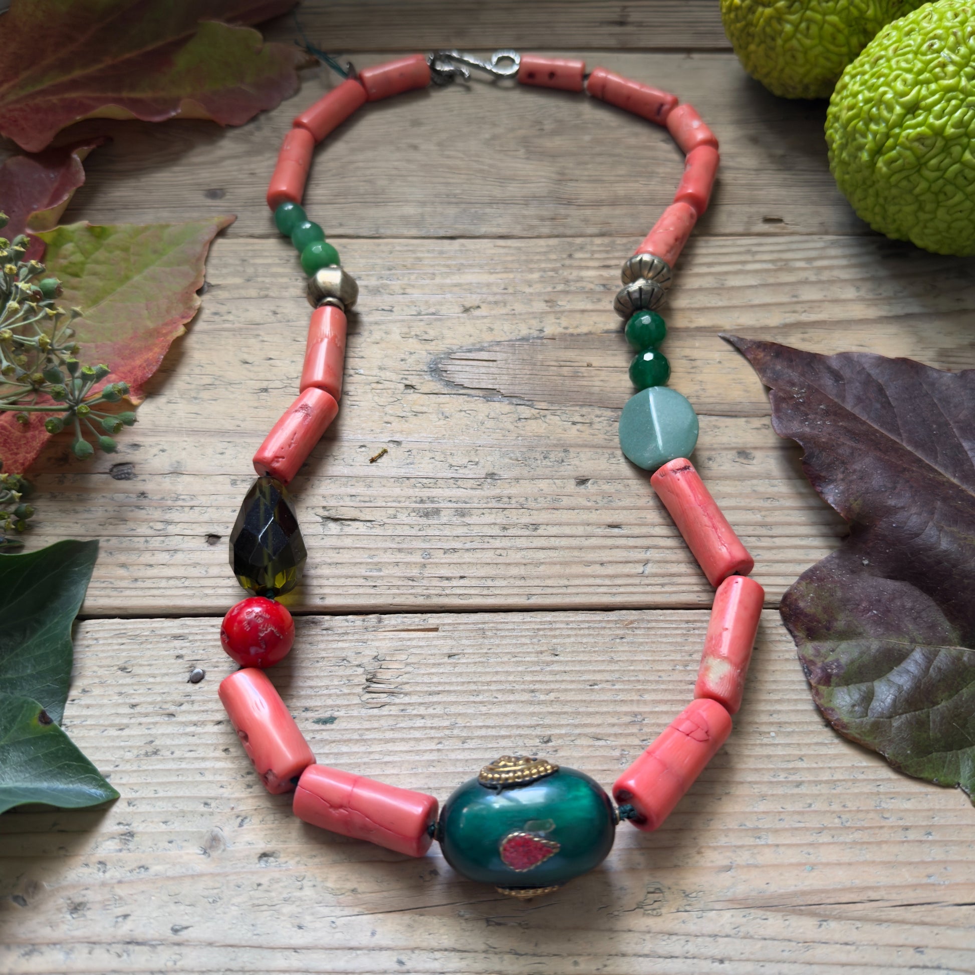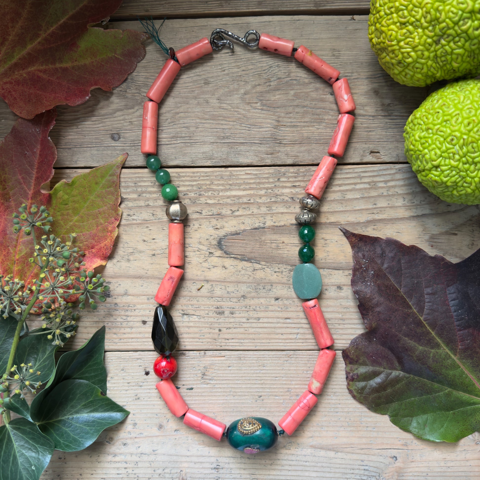 Collana composta da cilindri in corallo bambù color salmone, sfere in giada colorata di verde, goccia in vetro verde bottiglia, grande sfera in corallo bambù rosso ed elemento in avventurina. Rondelle indiane in argentone e grande elemento centrale realizzato a mano in resina.