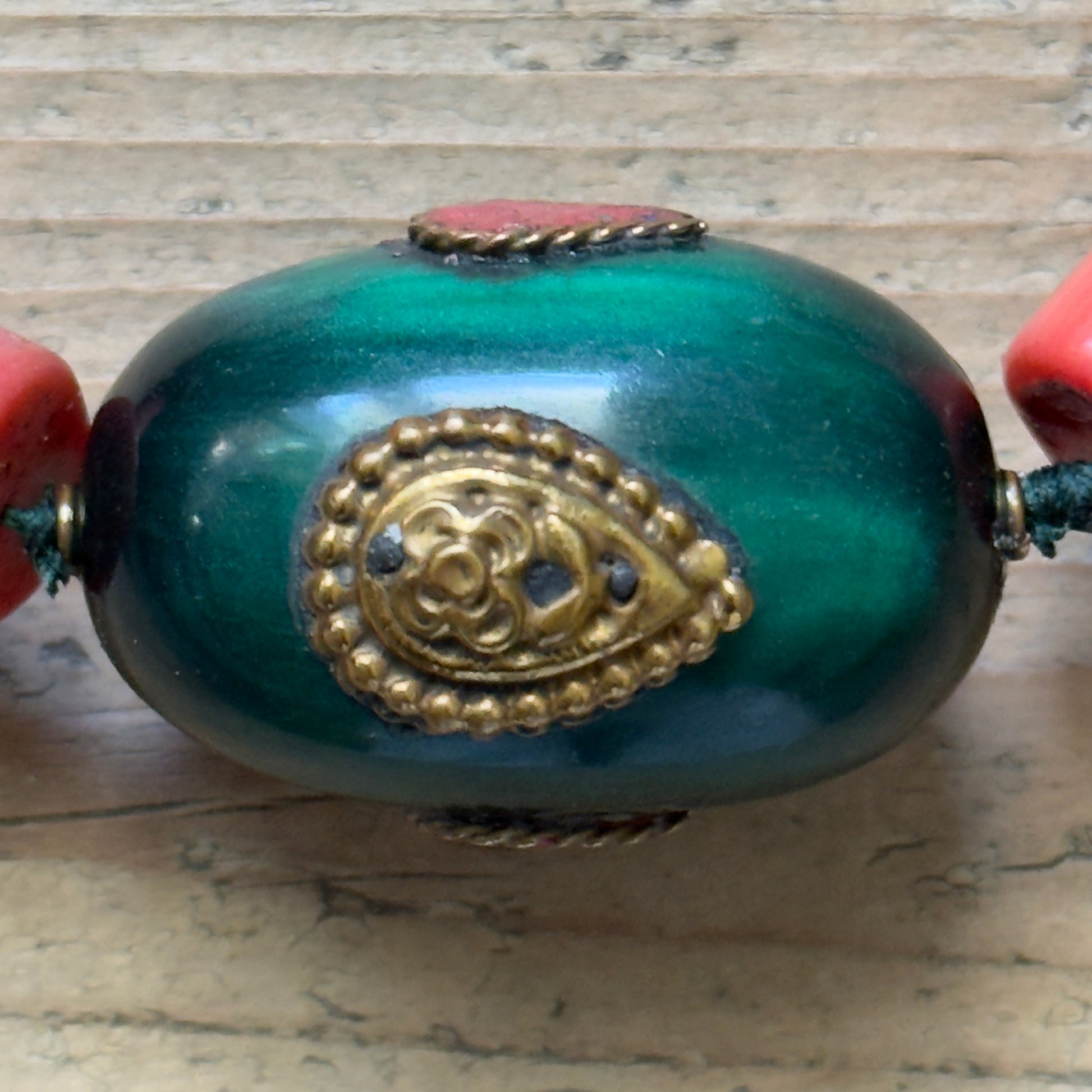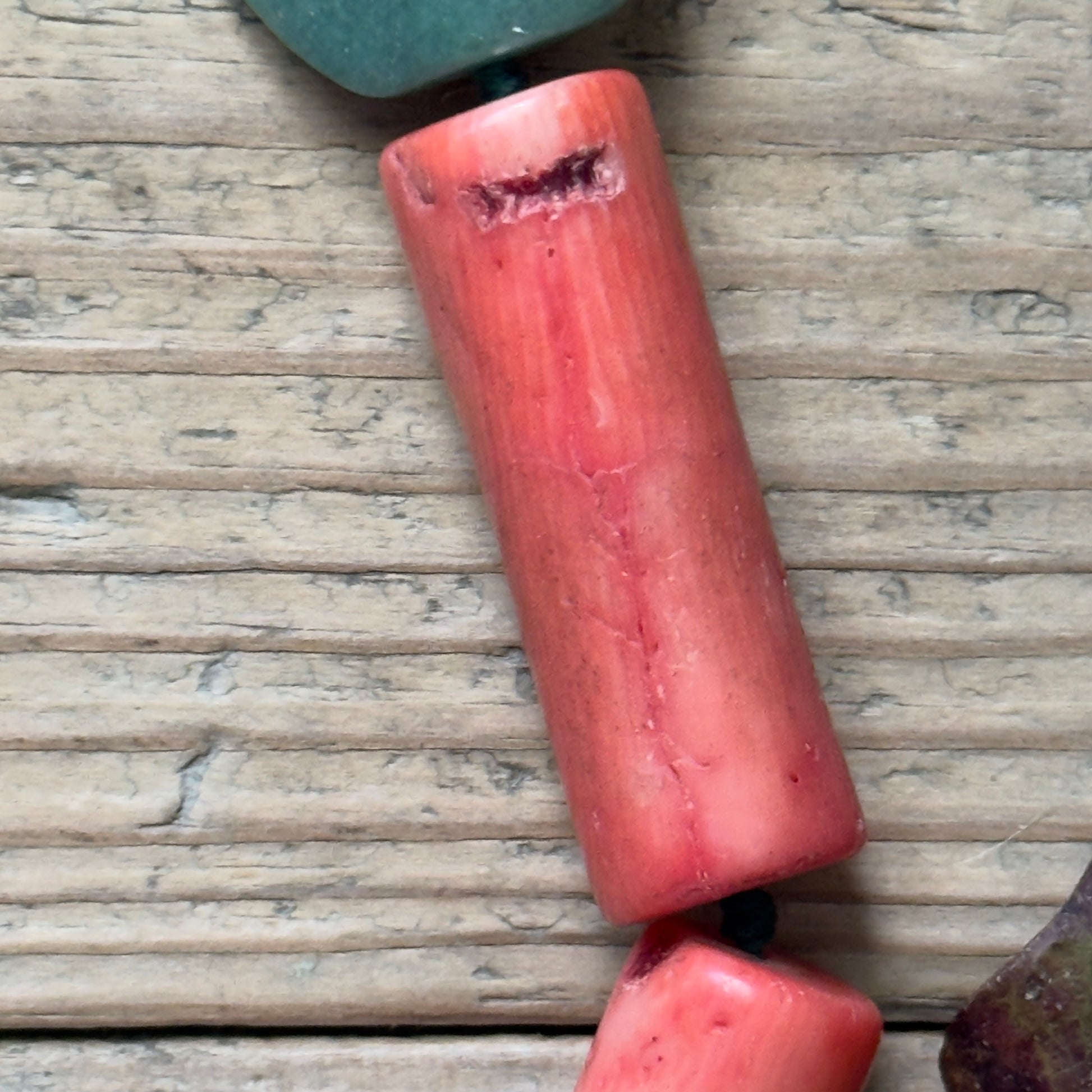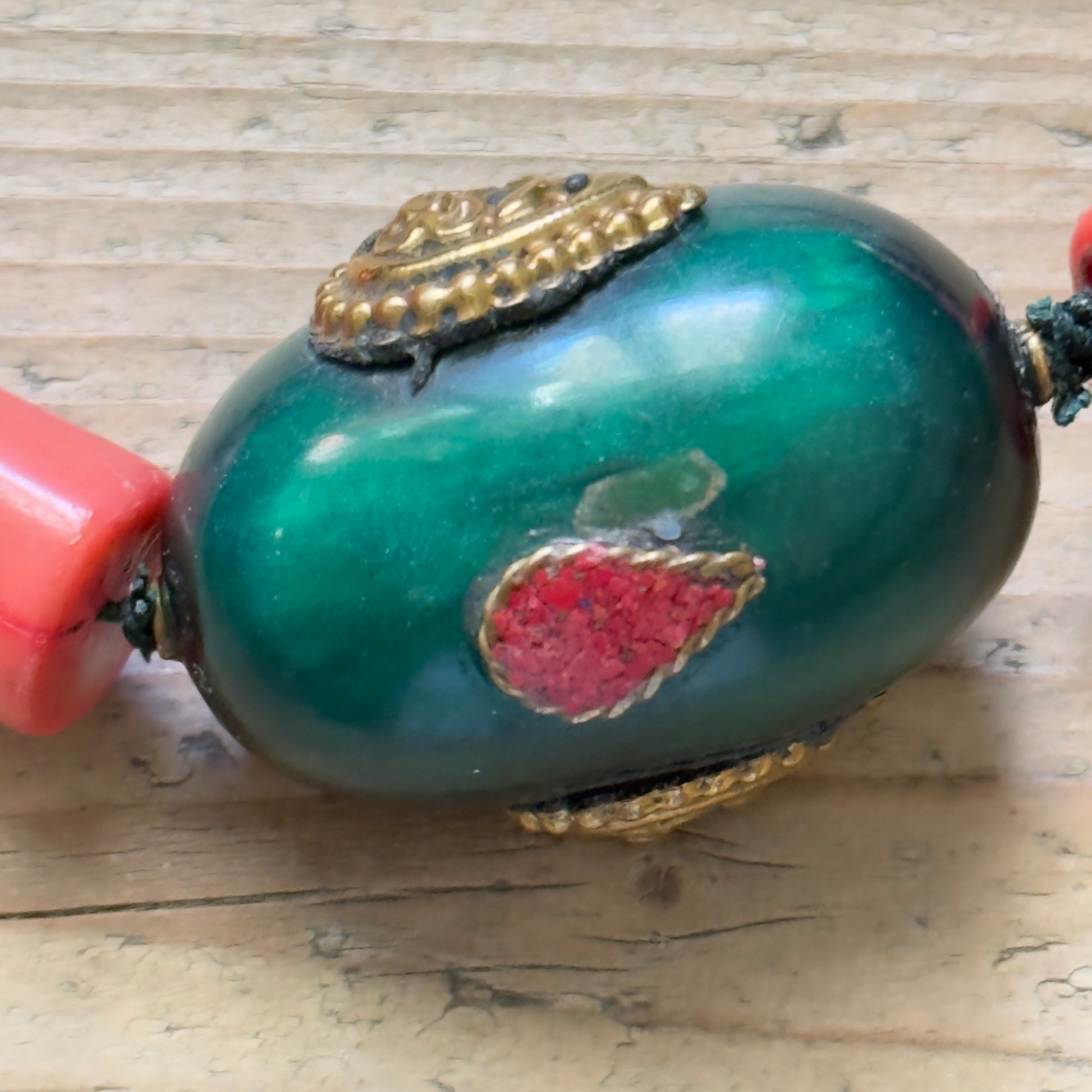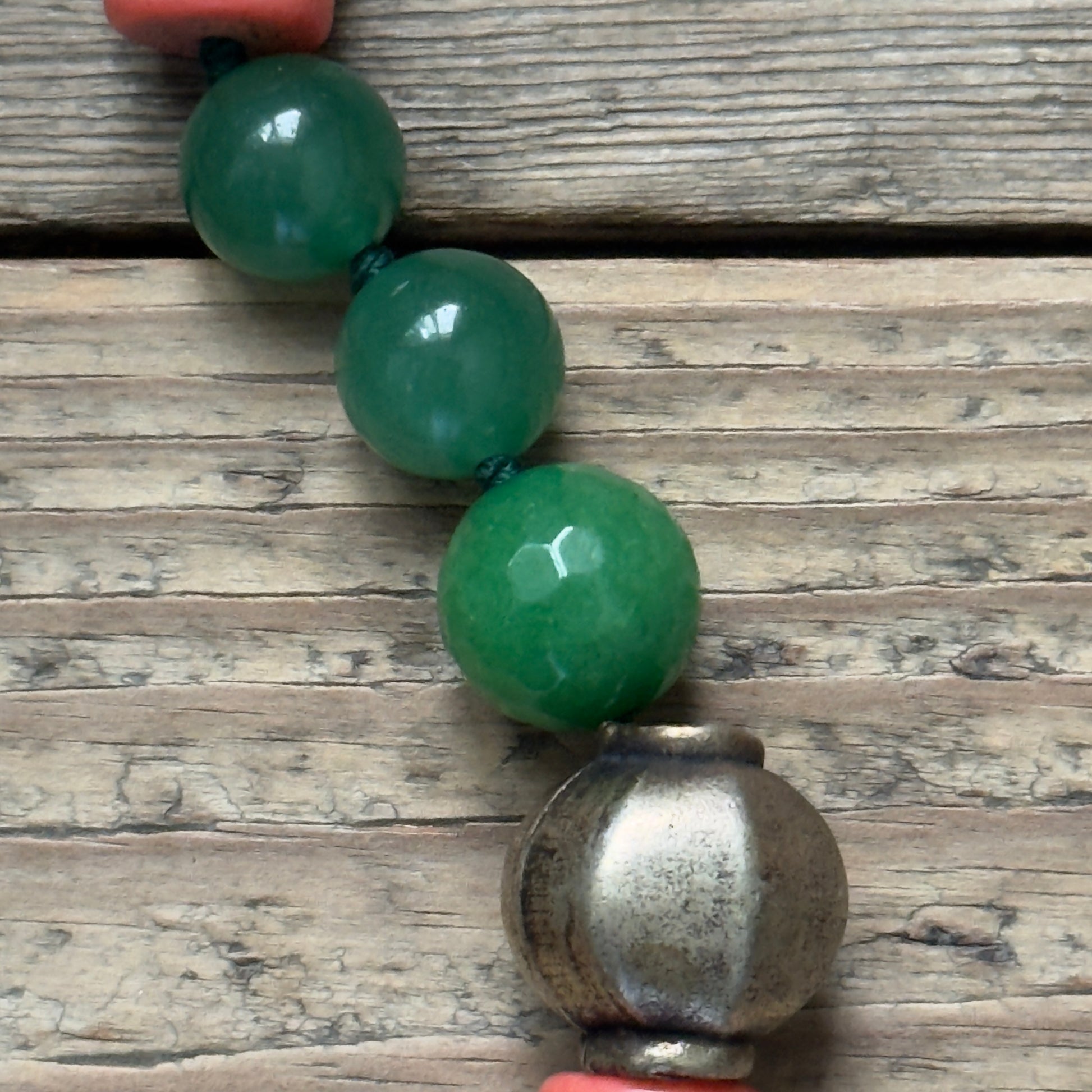 Collana composta da cilindri in corallo bambù color salmone, sfere in giada colorata di verde, goccia in vetro verde bottiglia, grande sfera in corallo bambù rosso ed elemento in avventurina. Rondelle indiane in argentone e grande elemento centrale realizzato a mano in resina.
