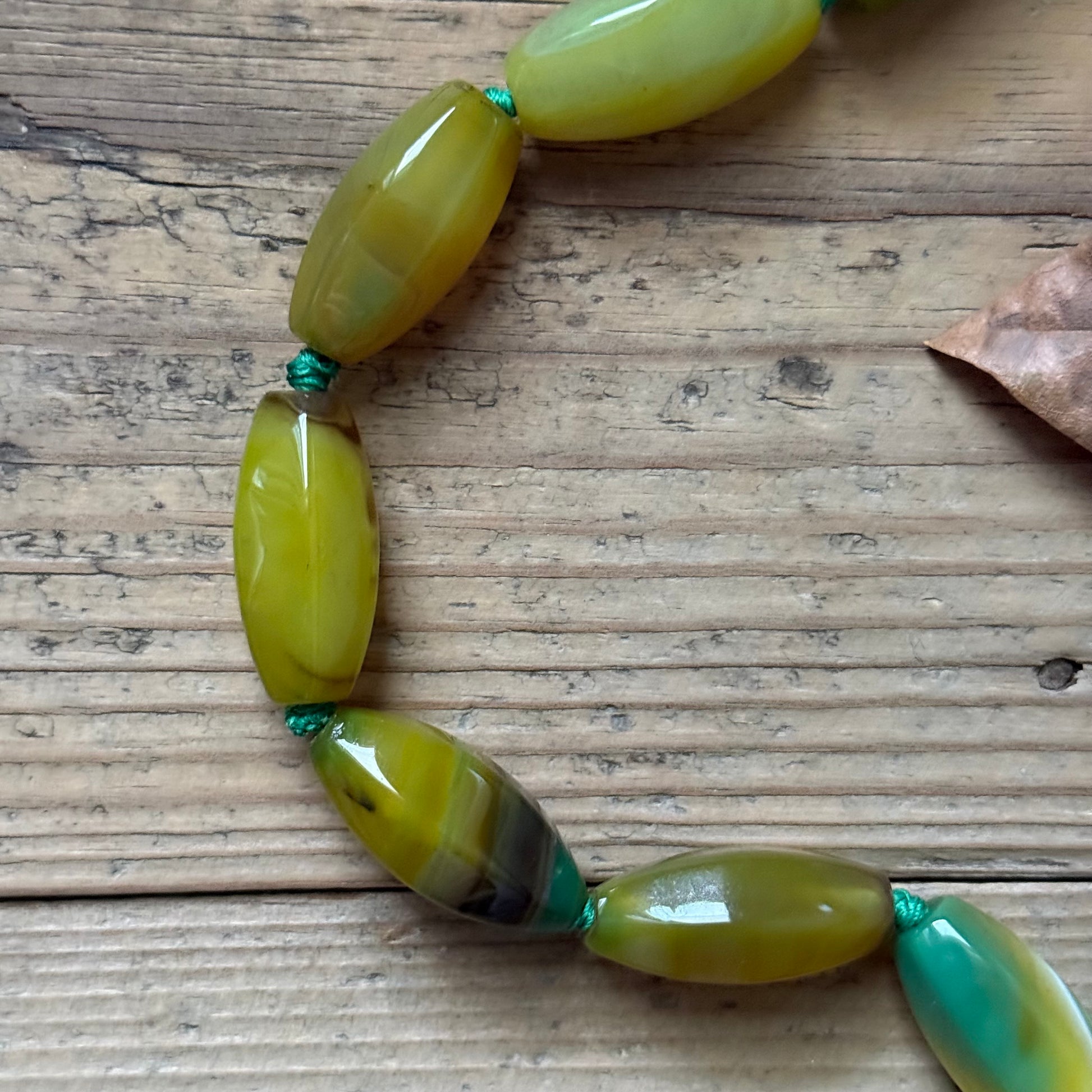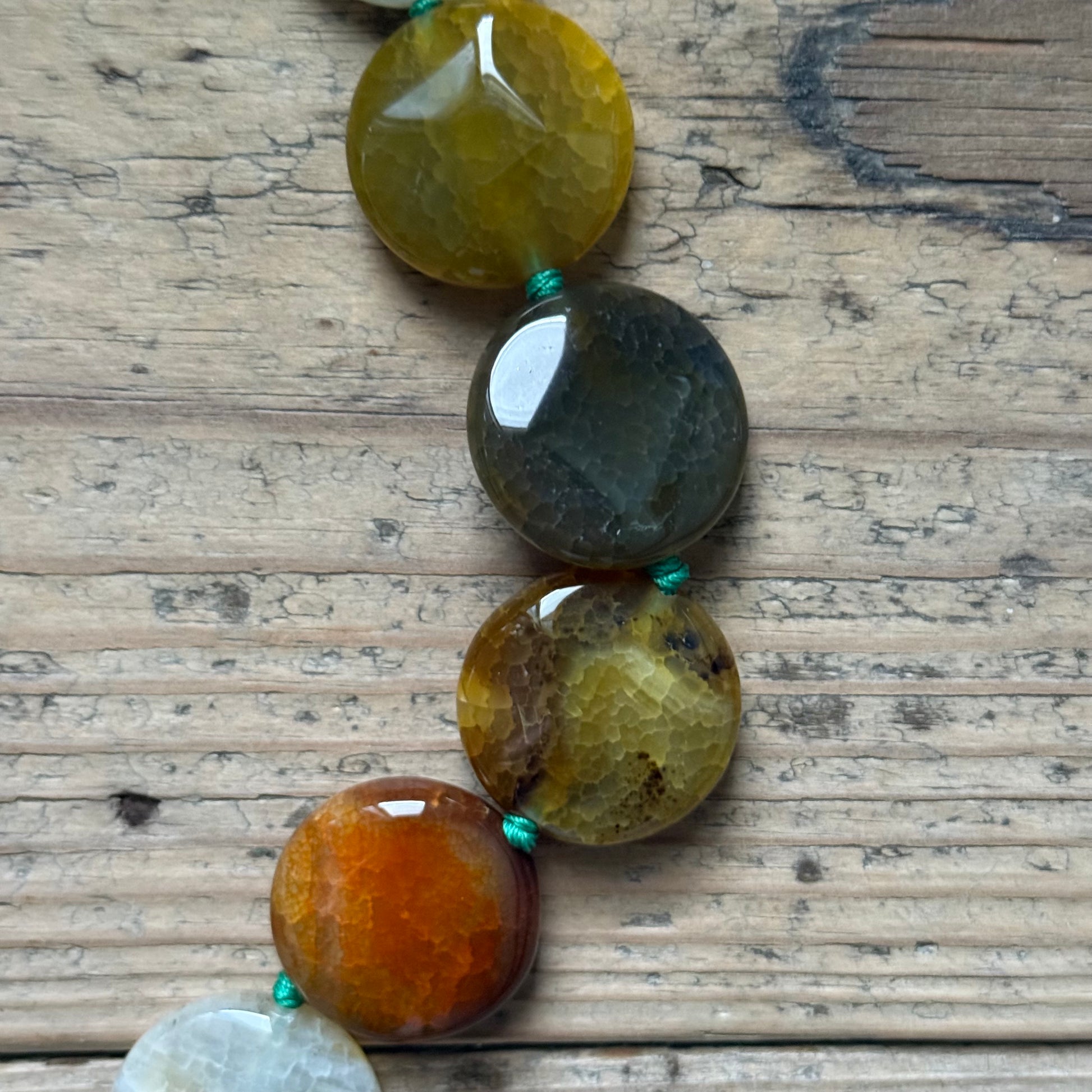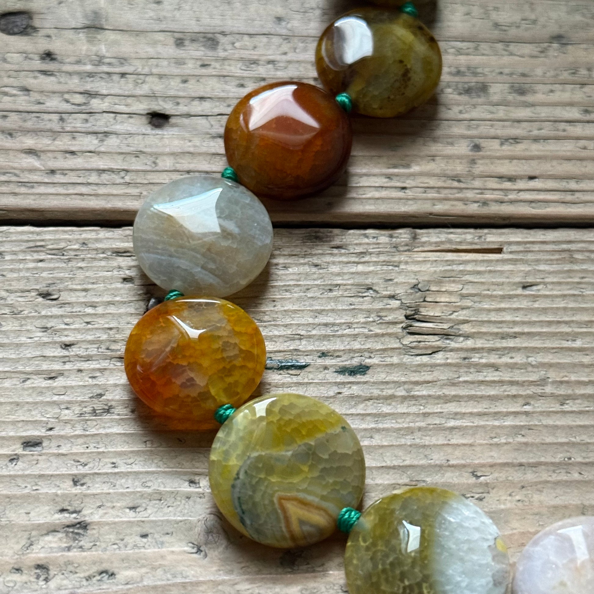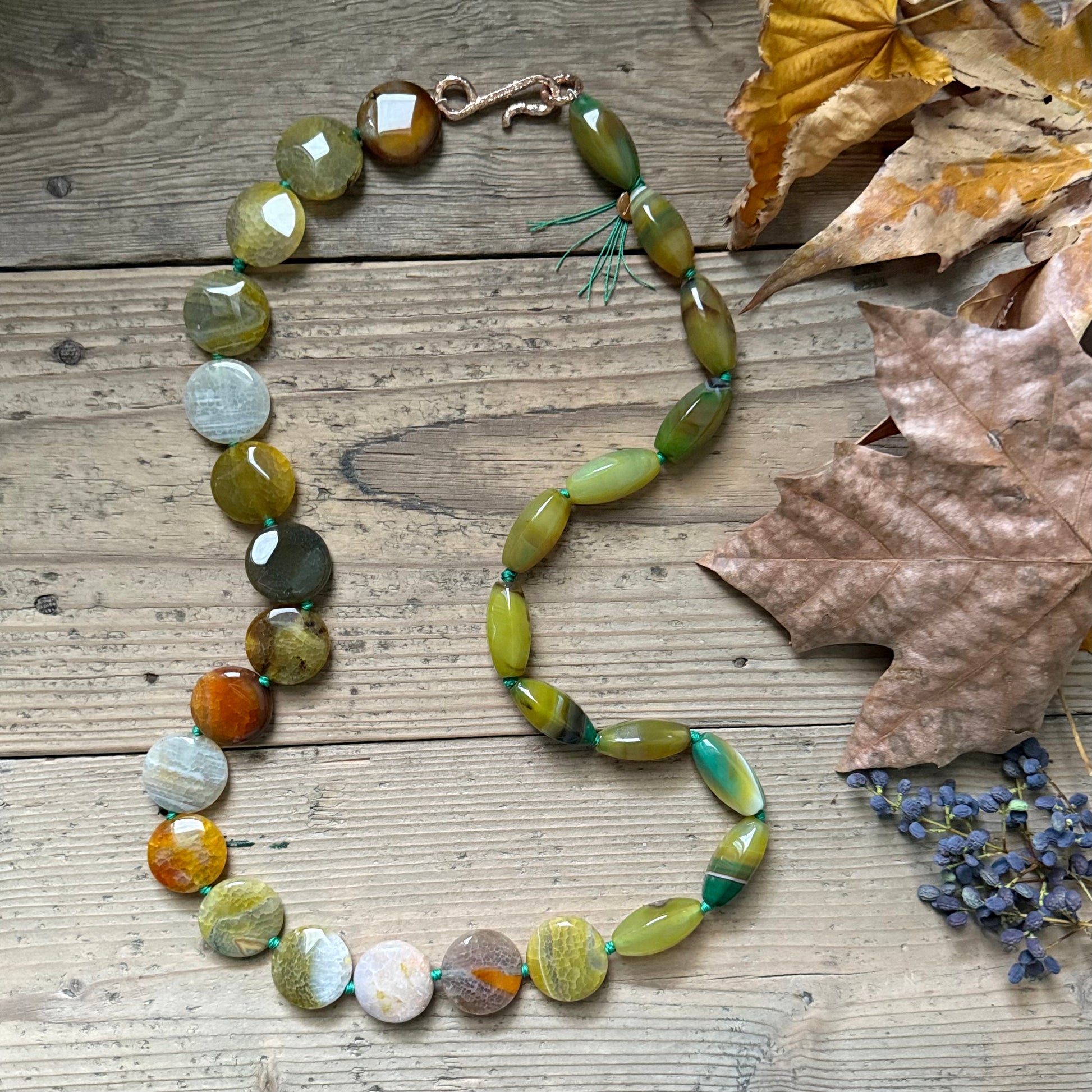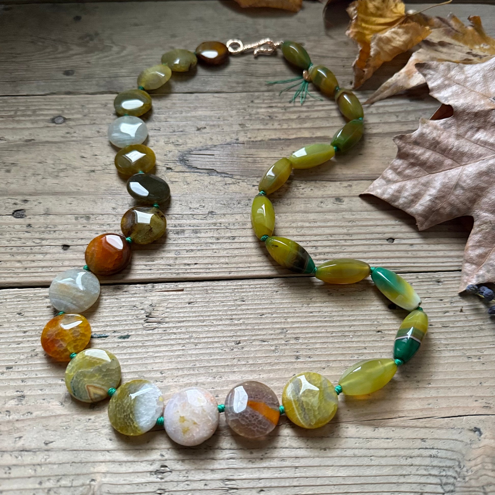 Long necklace, designed to be worn as a choker, wrapped twice around the neck. Colorful agate in forest tones in two different cuts. Gold-plated brass clasp. Aquamarine knots.