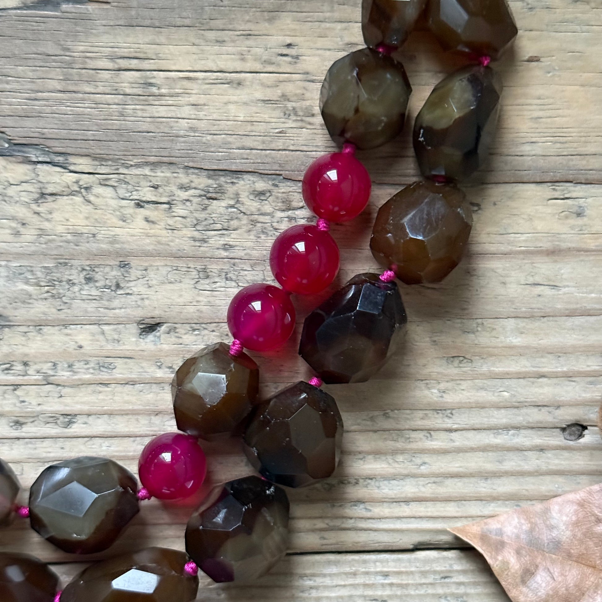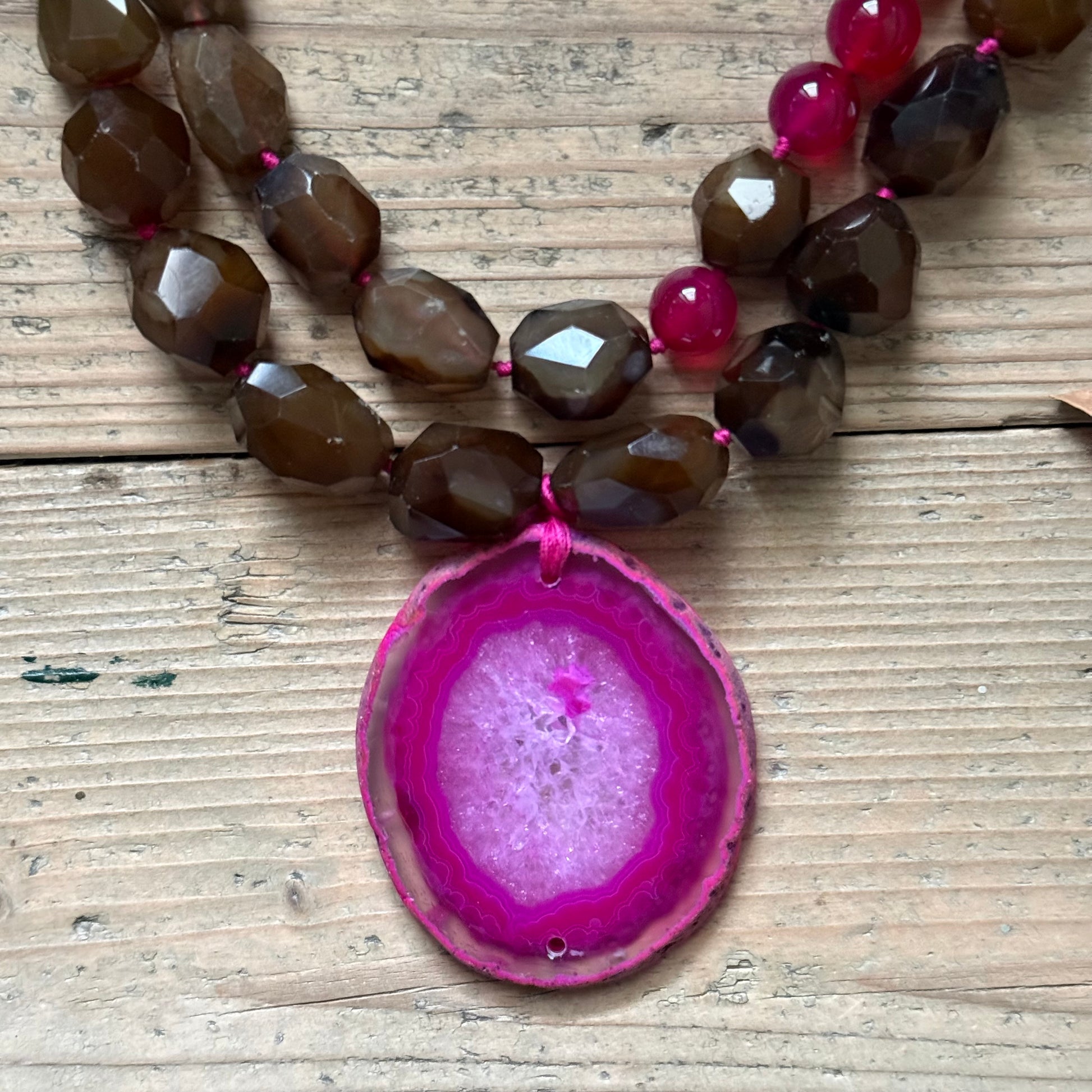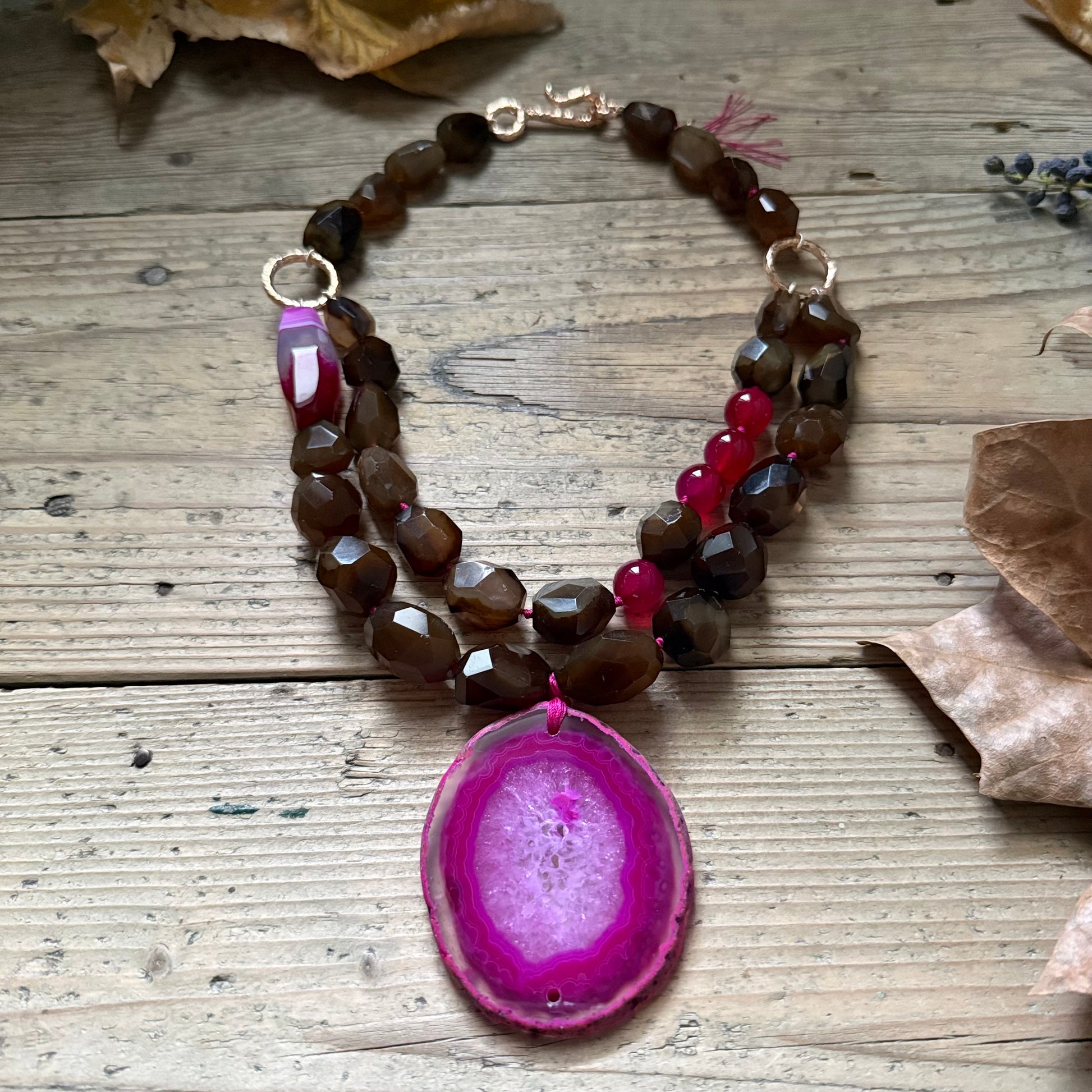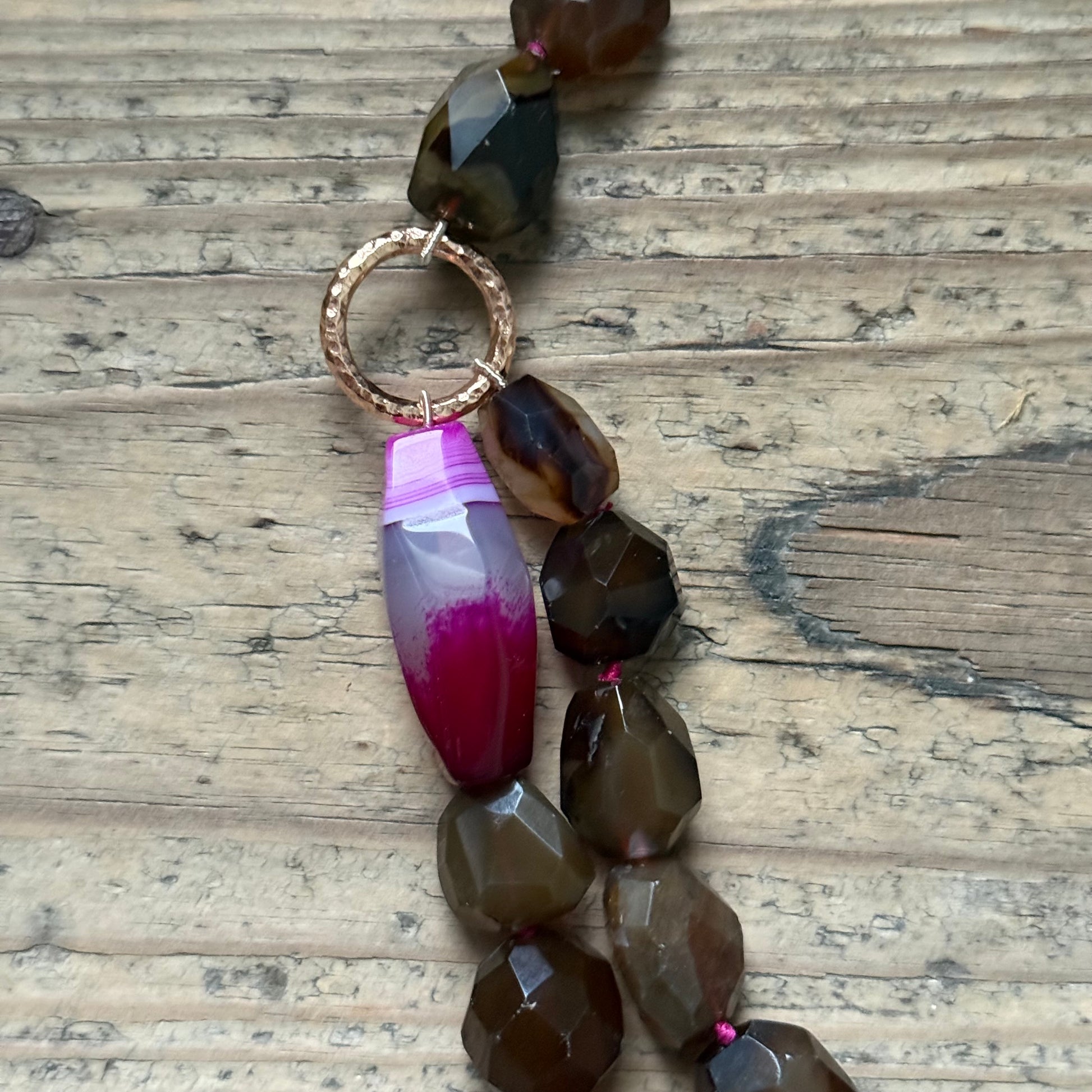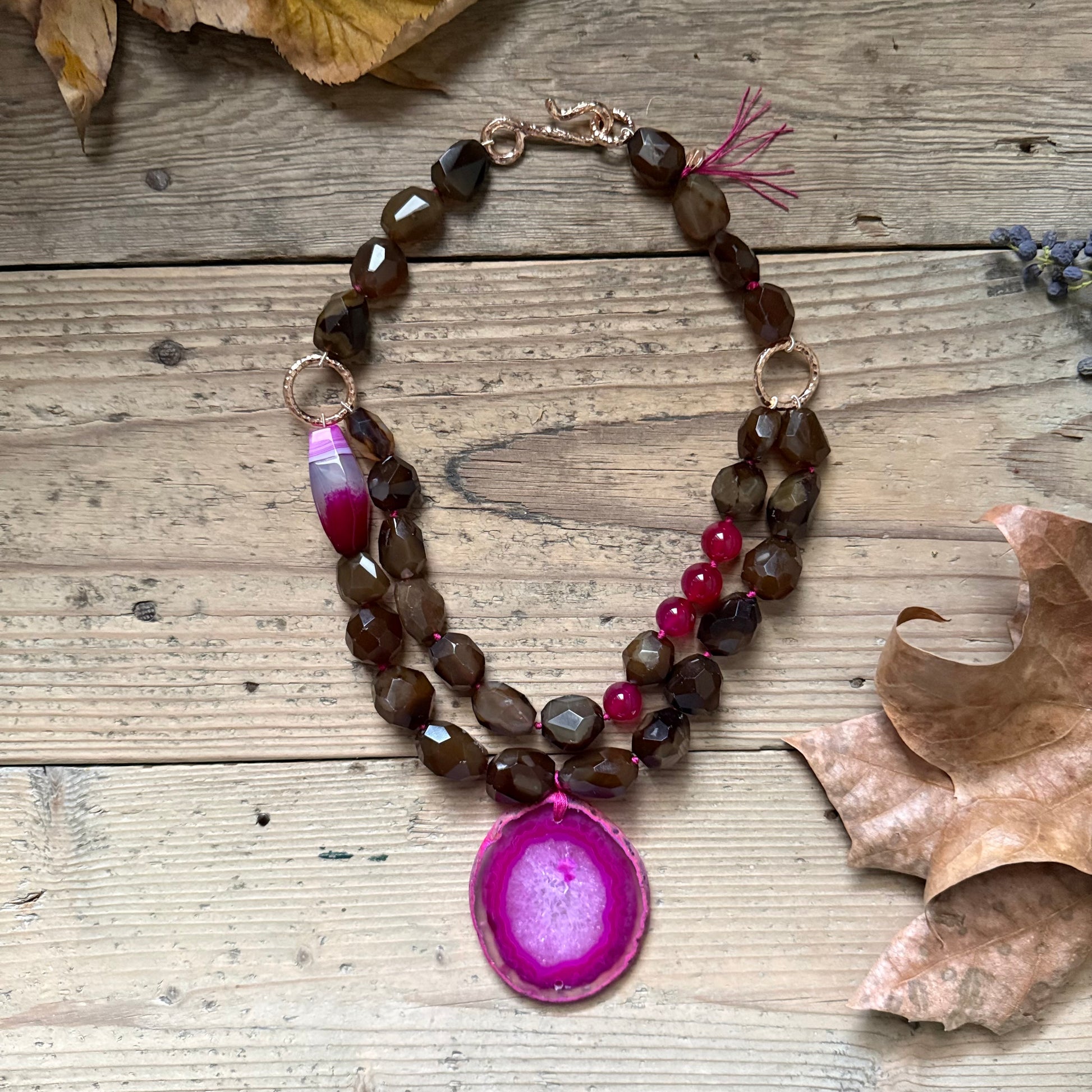 Collana composta da grandi pepite in calcedonio marrone sfaccettato a mano, abbinate a sfere e ogiva in agata fucsia. Funge da ciondolo una sezione di grande agata fucsia e bianca.