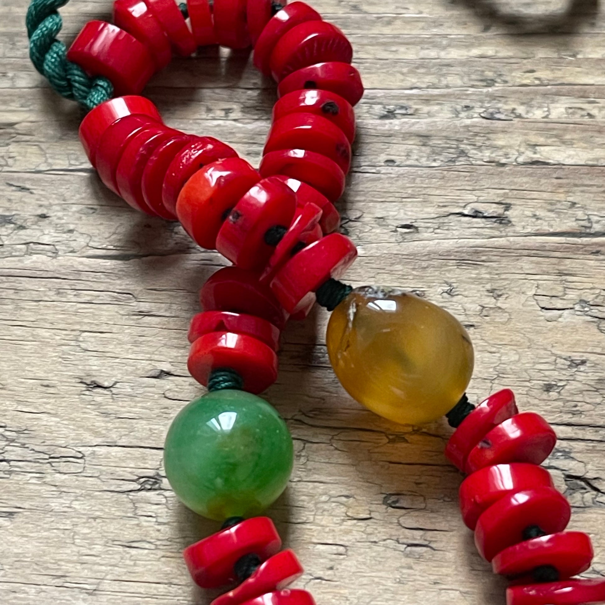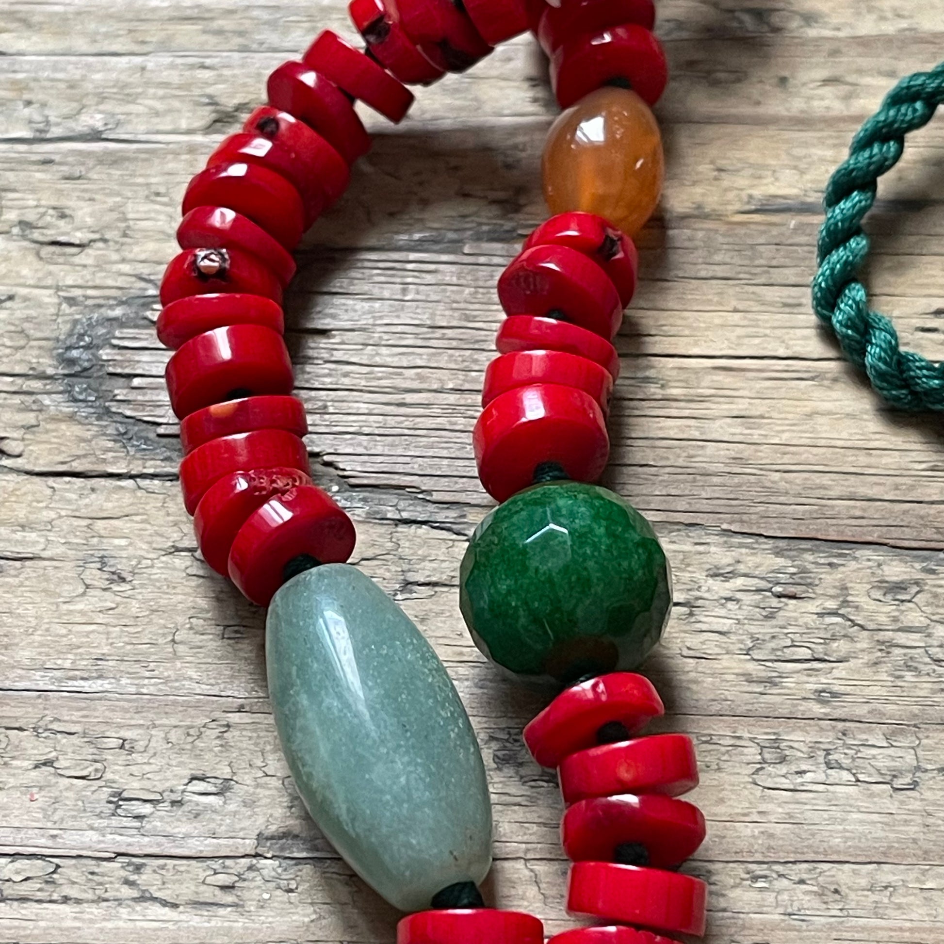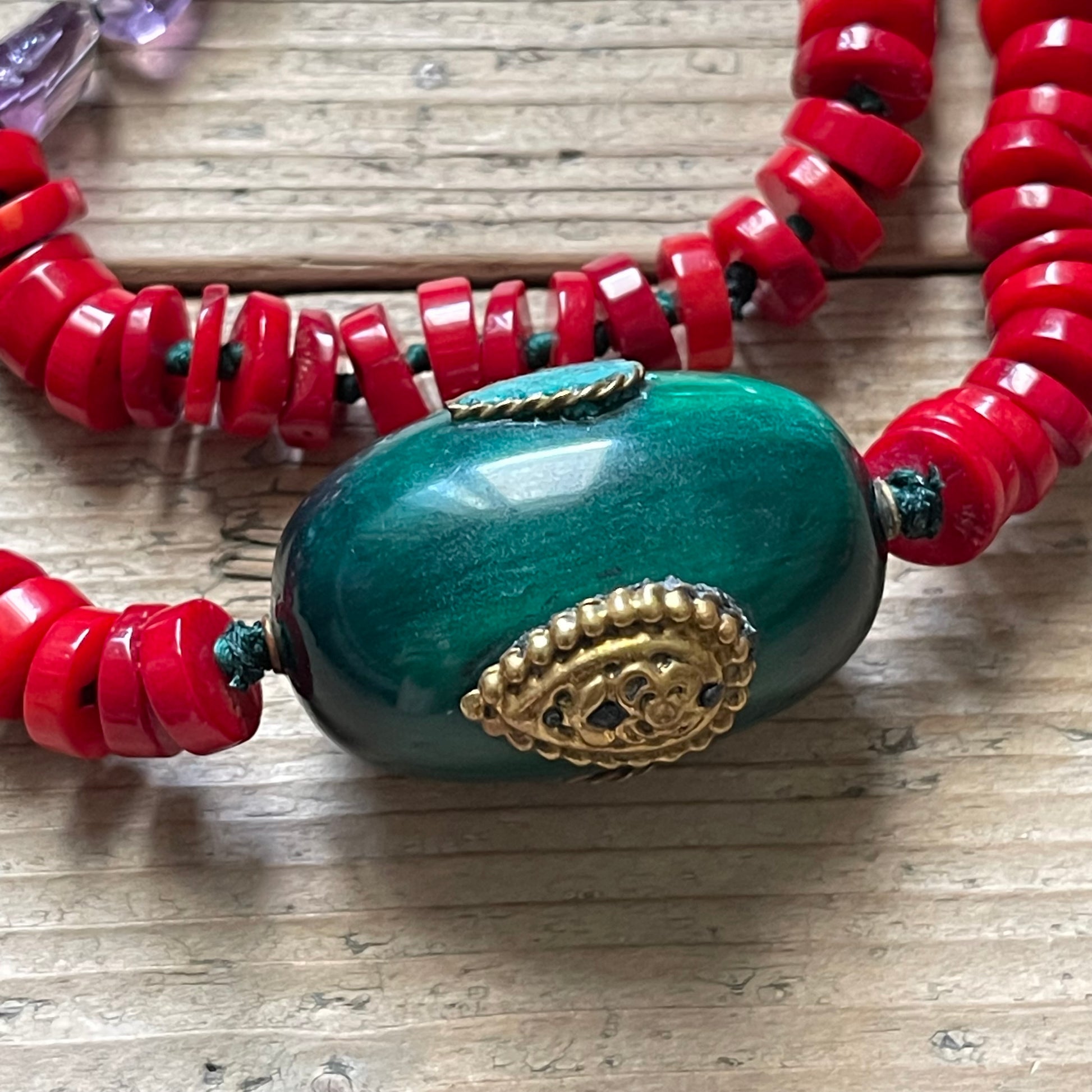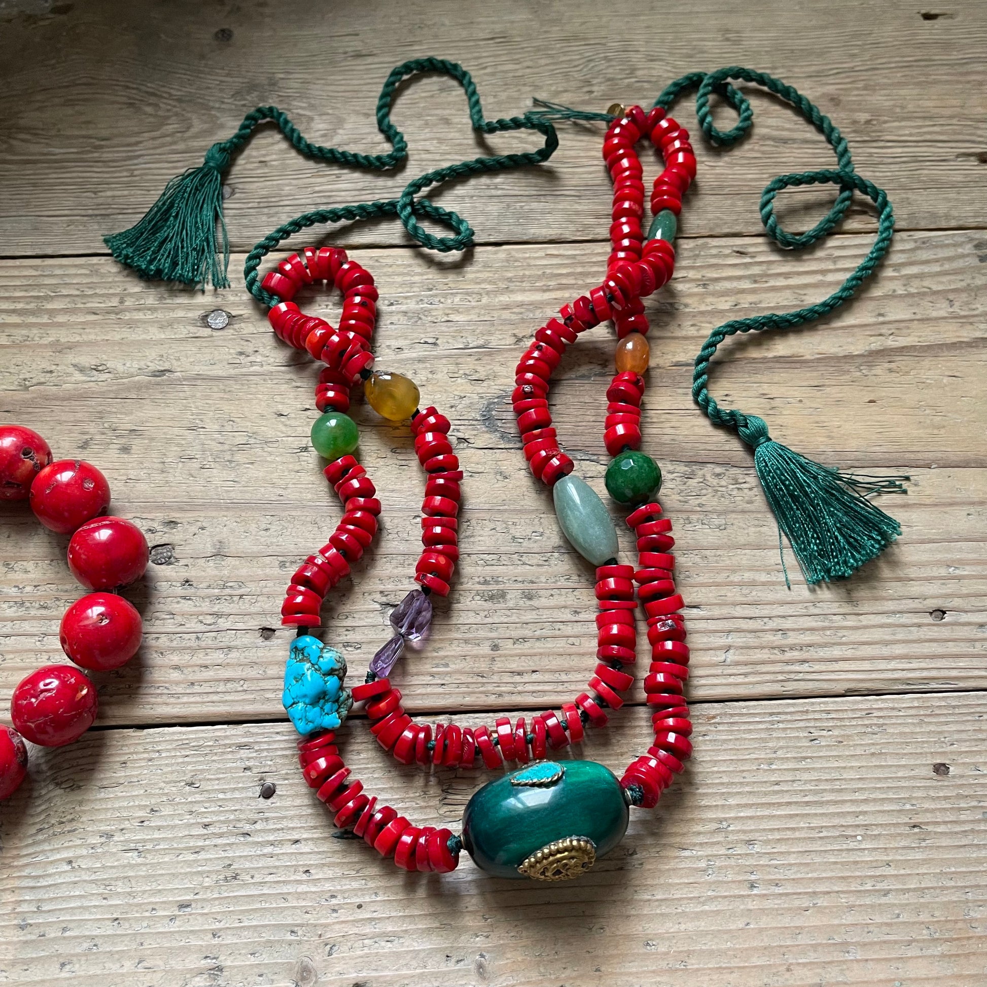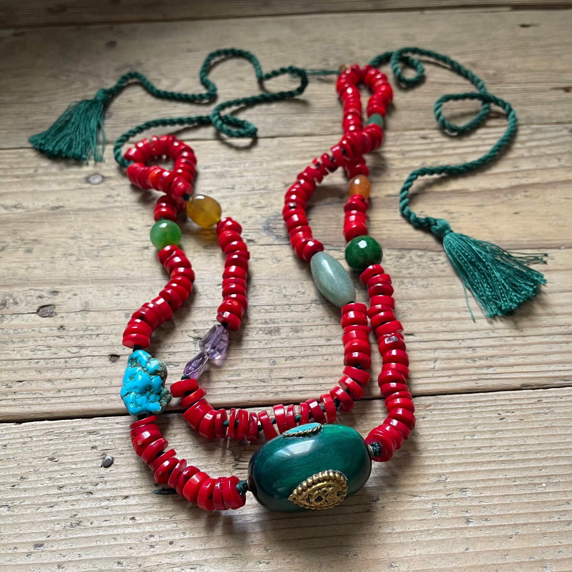 Necklace featuring red bamboo coral rondelles, various gemstones (amethyst, agate, howlite, jade, aventurine), and a large handmade element made of resin, metal, and stones. Dark green knots, cords, and tassels.