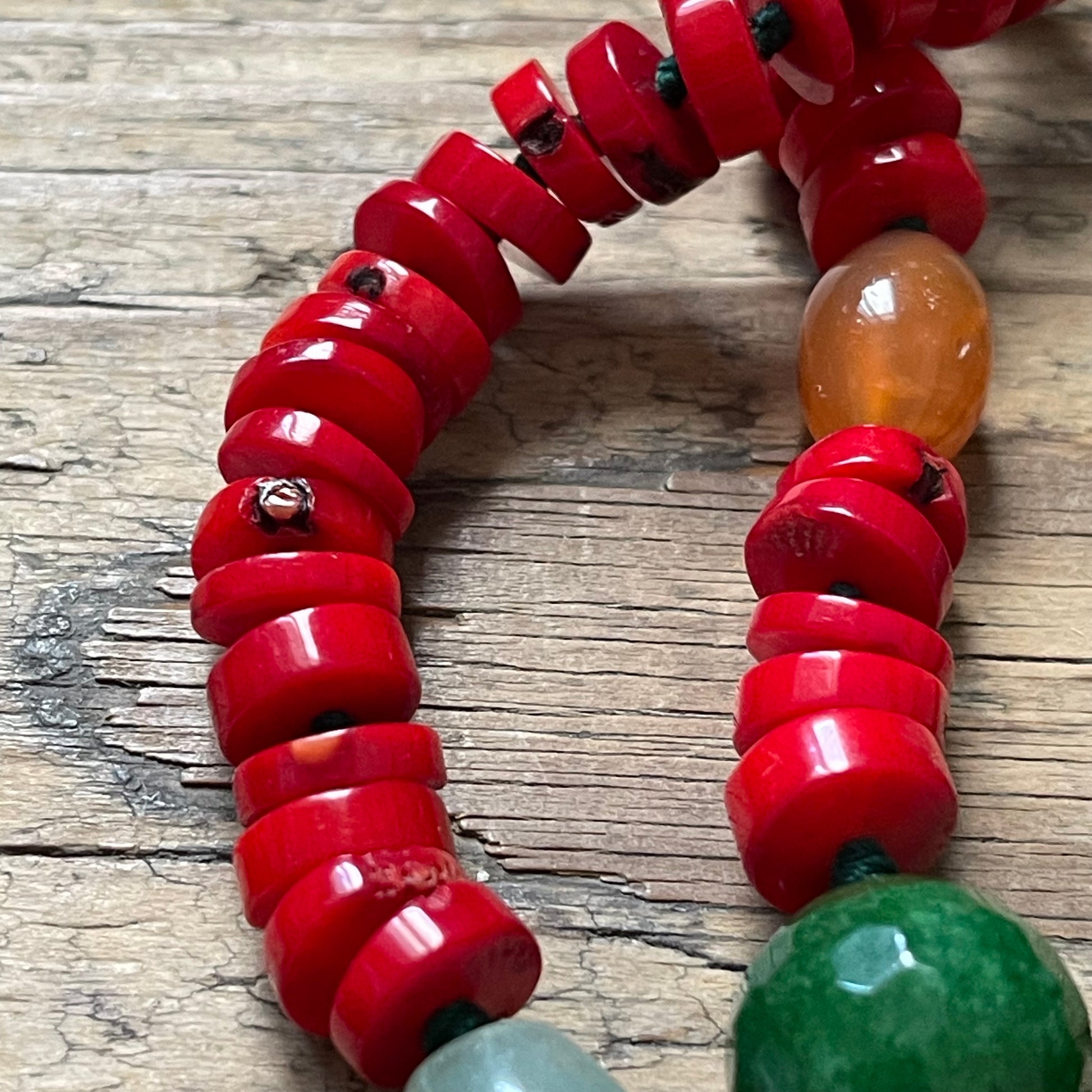 Collana composta da rondelle in corallo bambù rosso, varie tipologie di pietre dure (ametista, agata, howlite, giada, avventurina) e grande elemento fatto a mano in resina, metallo e pietre.