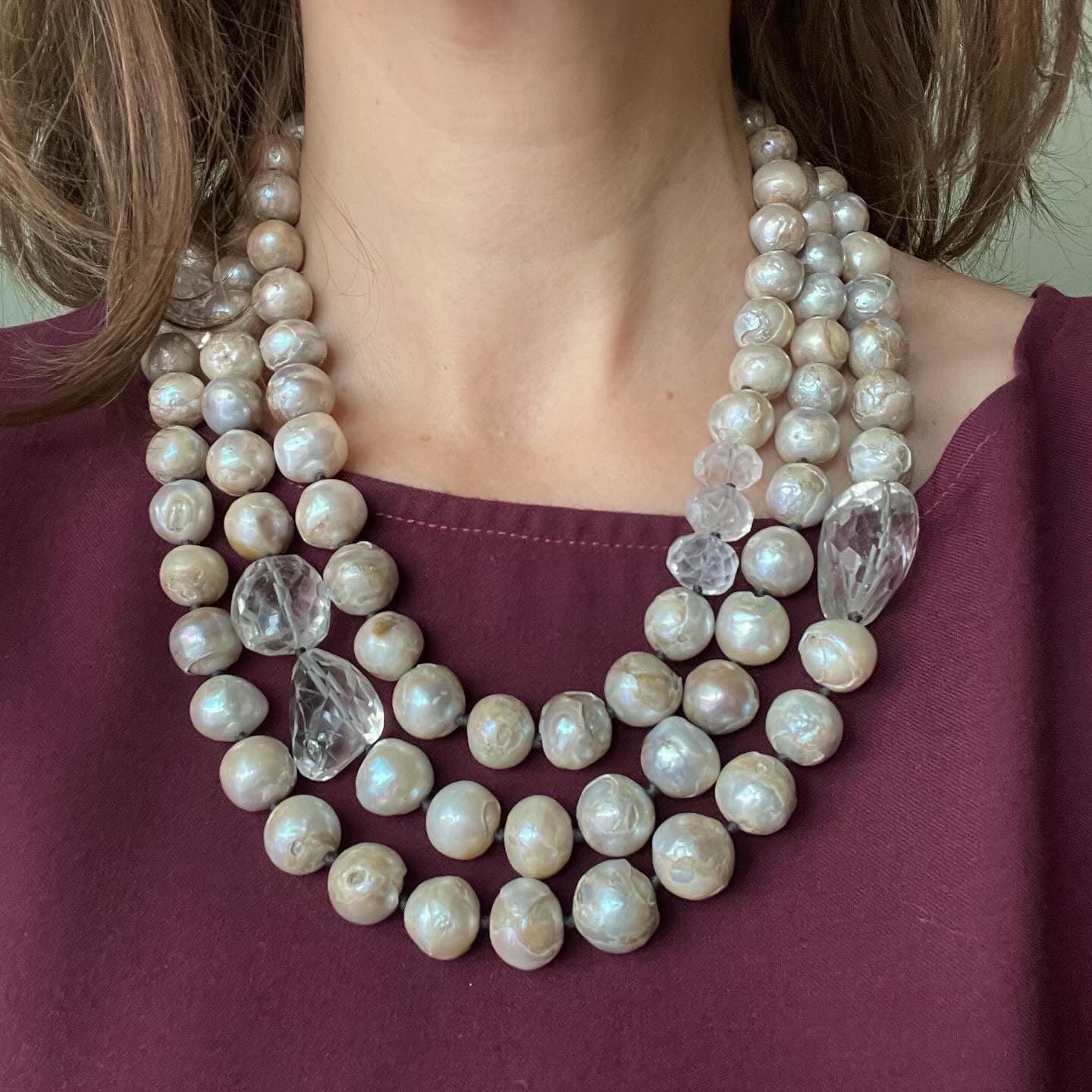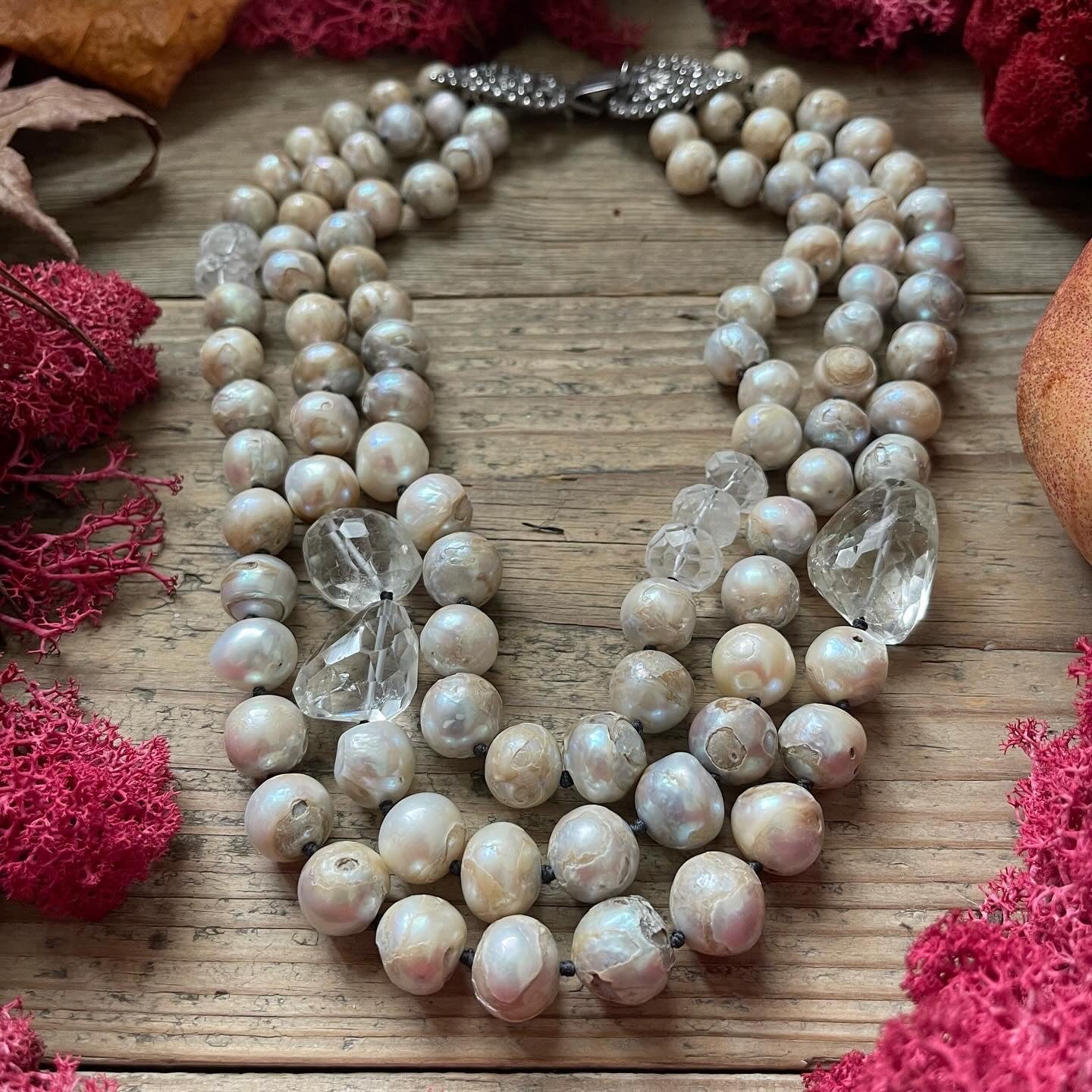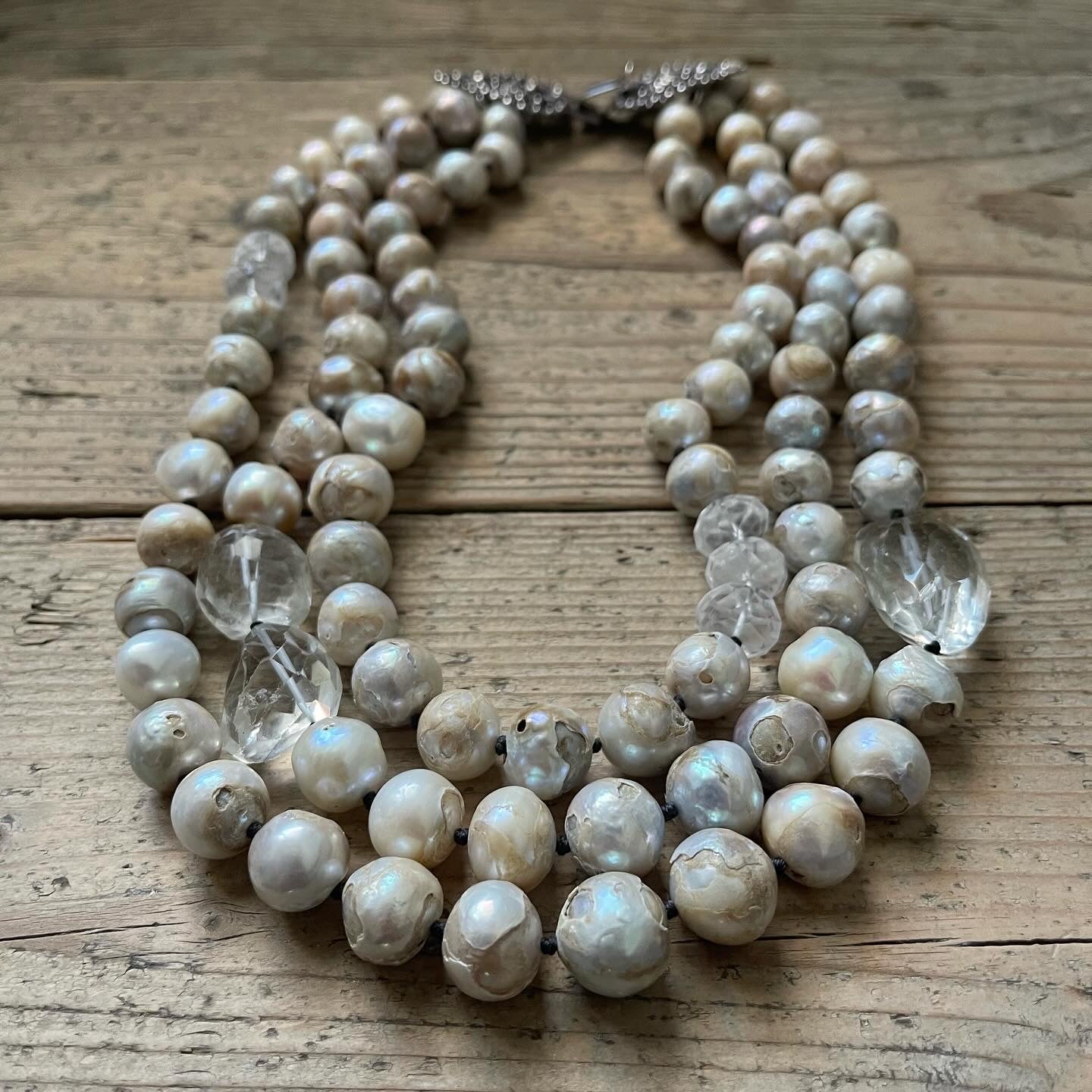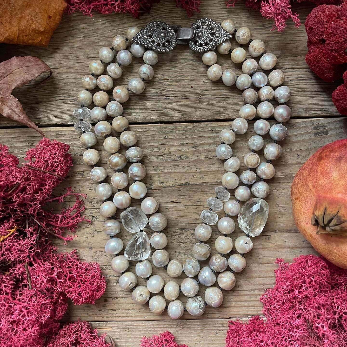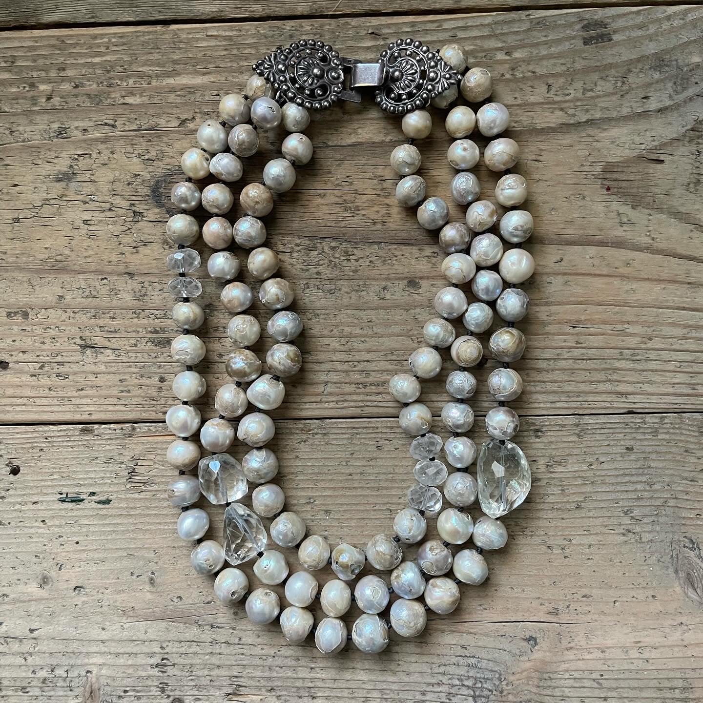 Collana realizzata con 3 fili in perle di acqua dolce, elementi in cristallo di rocca sfaccettato a mano e antica fibbia in argento. La fibbia in foto è solo un esempio e dovrà essere scelta e concordata tra quelle disponibili, prima di procedere con l’acquisto.