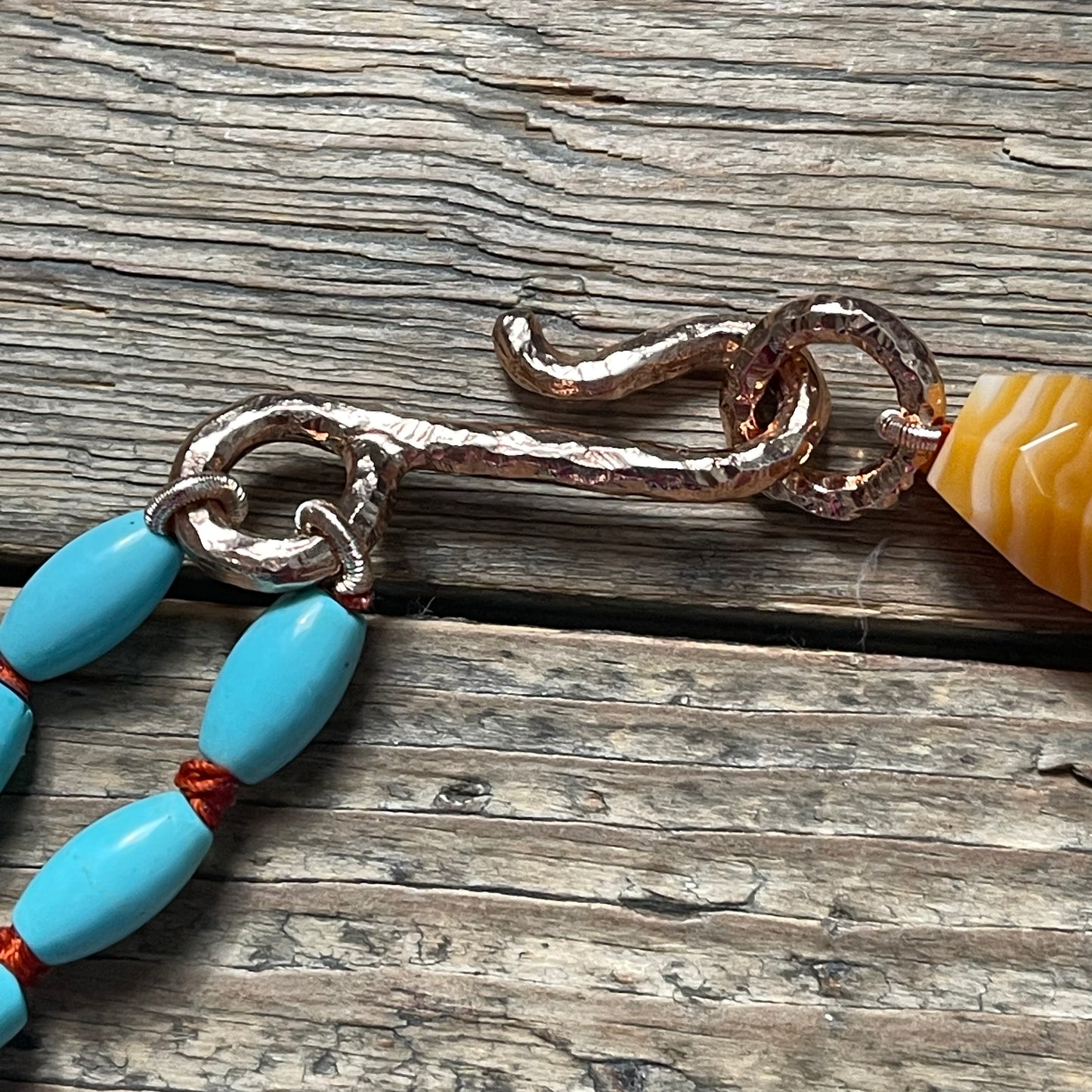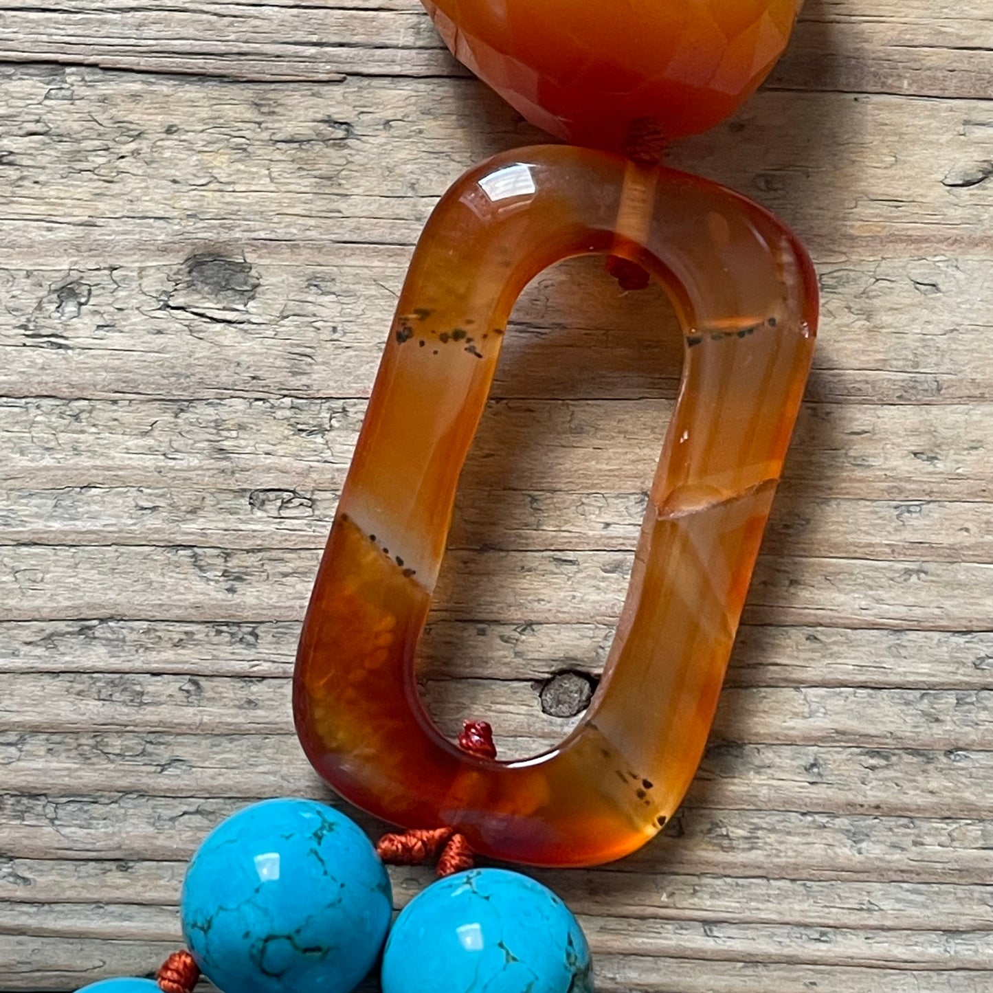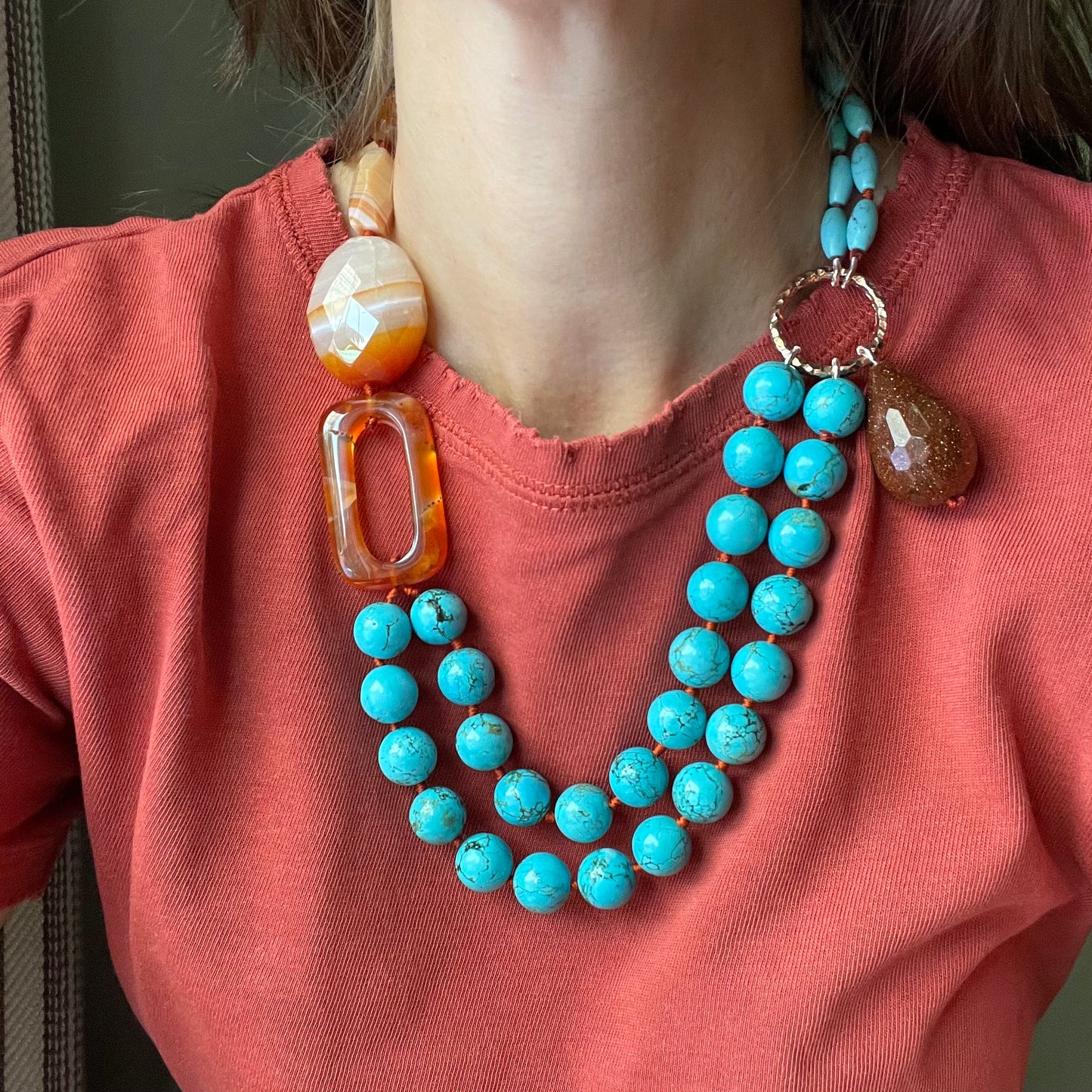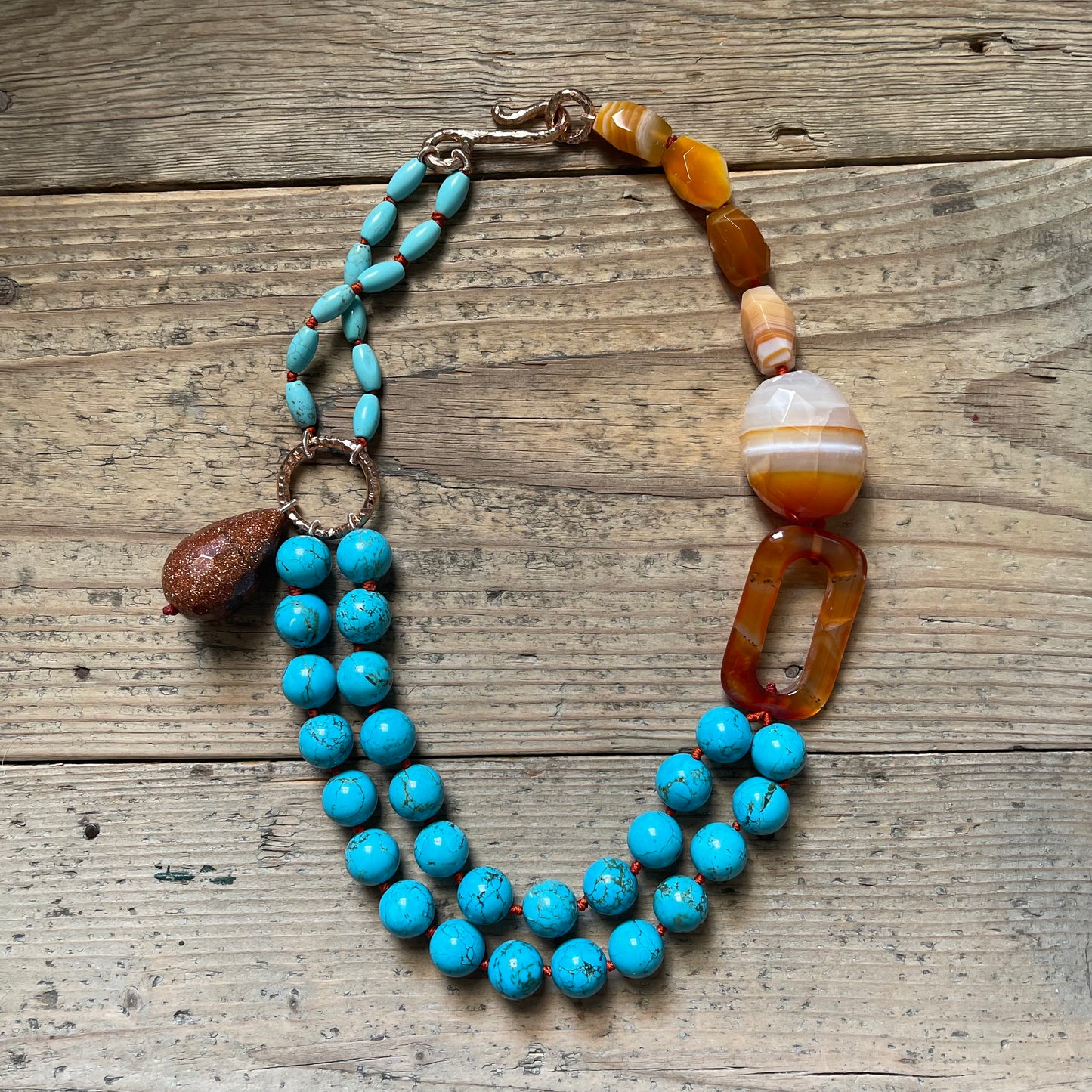 Collana asimmetrica composta da pepite e ogive di howlite color turchese, elementi in agata bianca striata in arancio e senape, 2 elementi in legno di ebano e grande goccia in bellissimo quarzo grigio. Gancio e anello in ottone con galvanica scura. Nodi marroni.