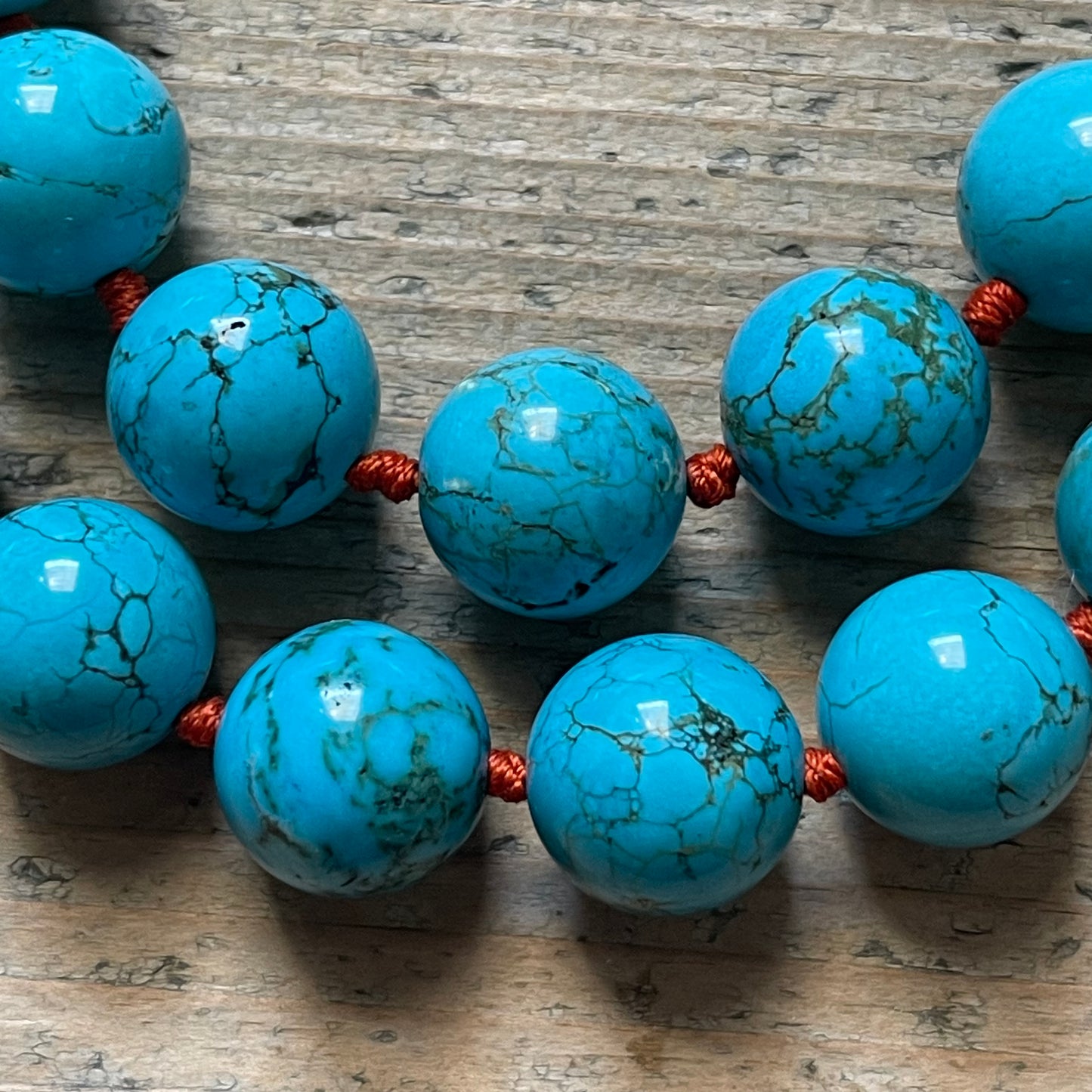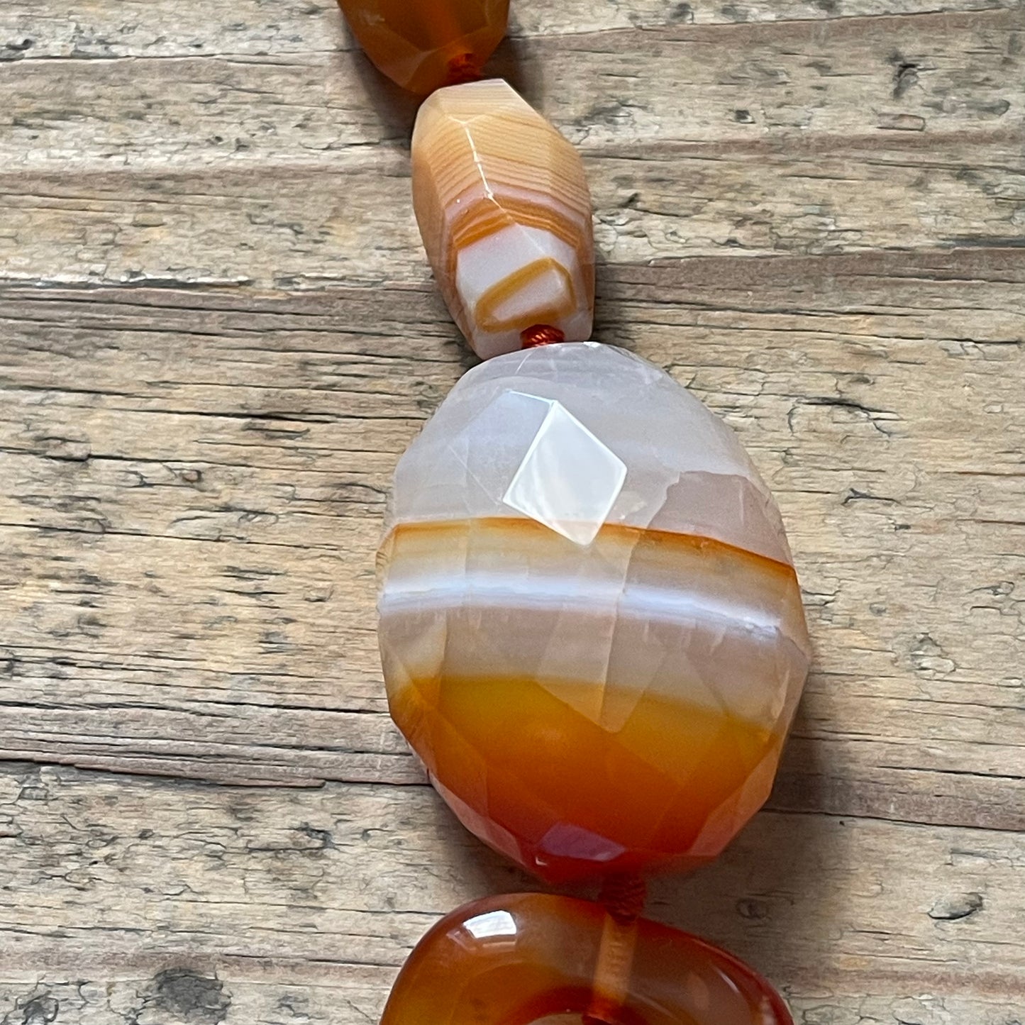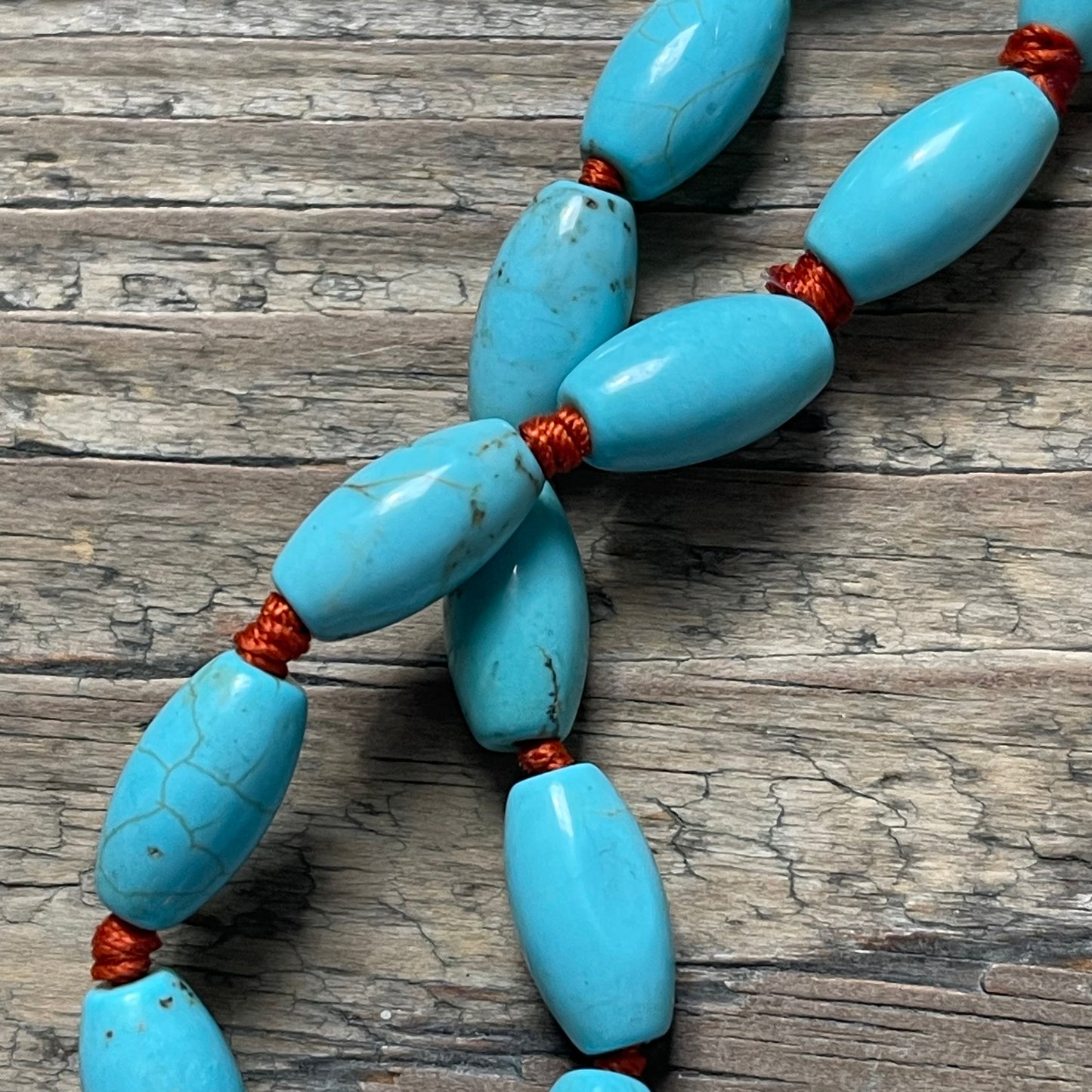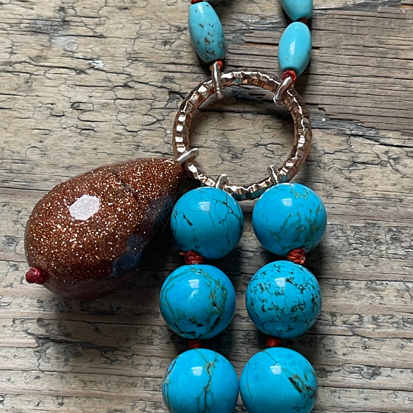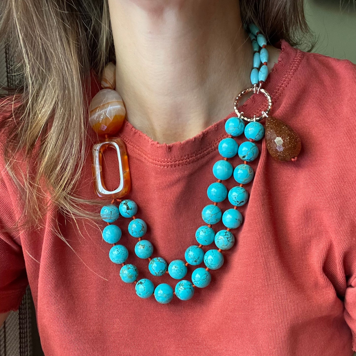 Collana asimmetrica composta da pepite e ogive di howlite color turchese, elementi in agata bianca striata in arancio e senape, 2 elementi in legno di ebano e grande goccia in bellissimo quarzo grigio. Gancio e anello in ottone con galvanica scura. Nodi marroni.