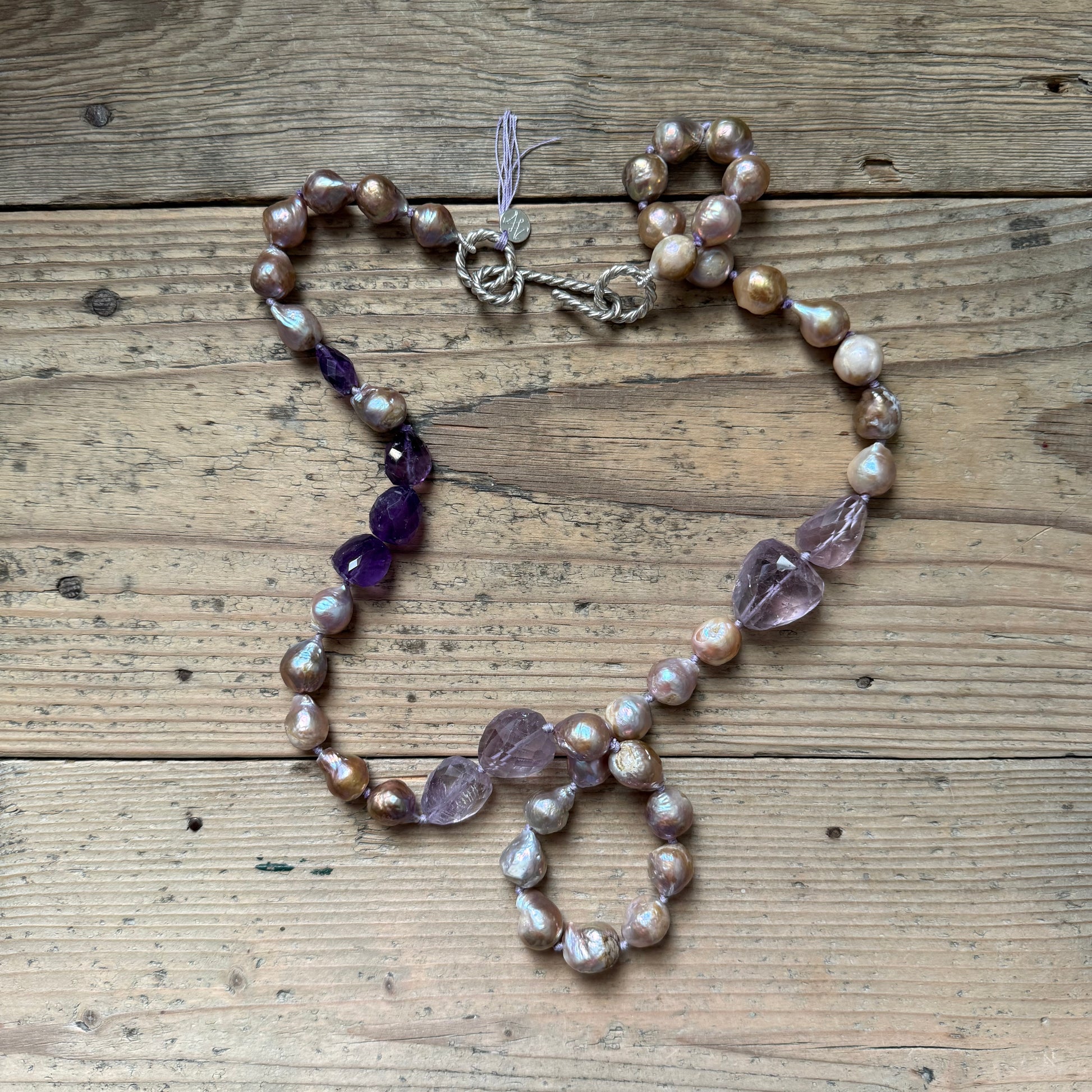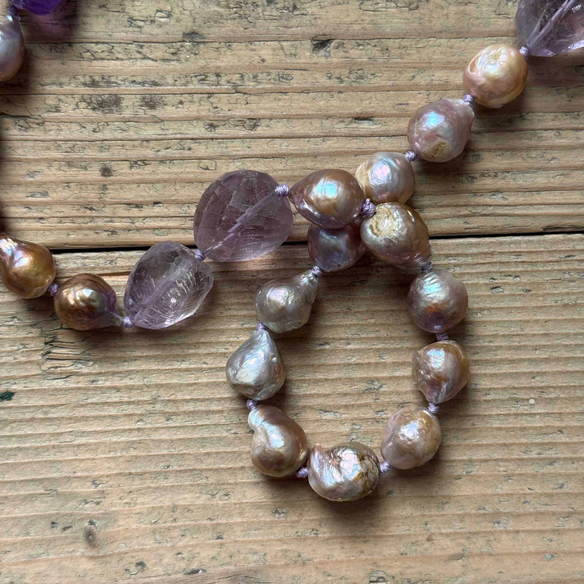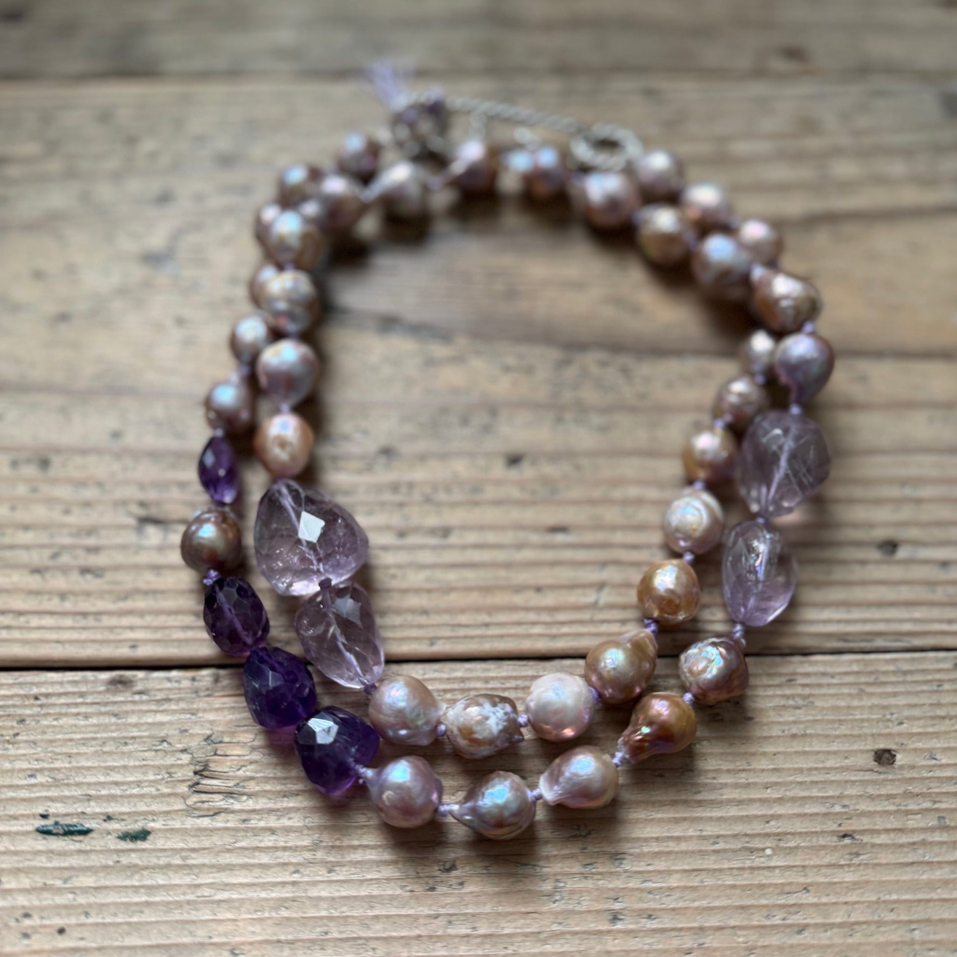 Collana composta da sfere irregolari in meravigliose perle d’acqua dolce dalle sfumature lilla, ametiste lilla e viola scuro.
