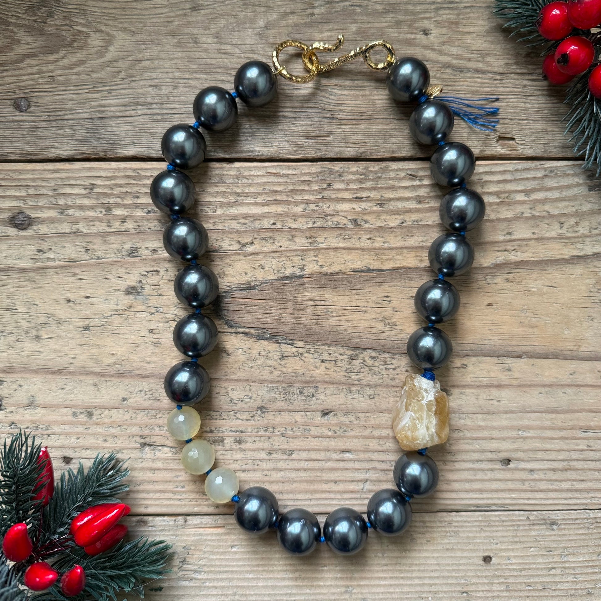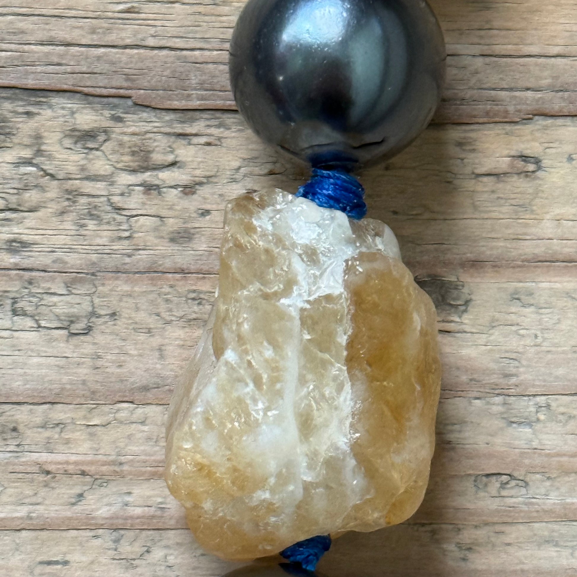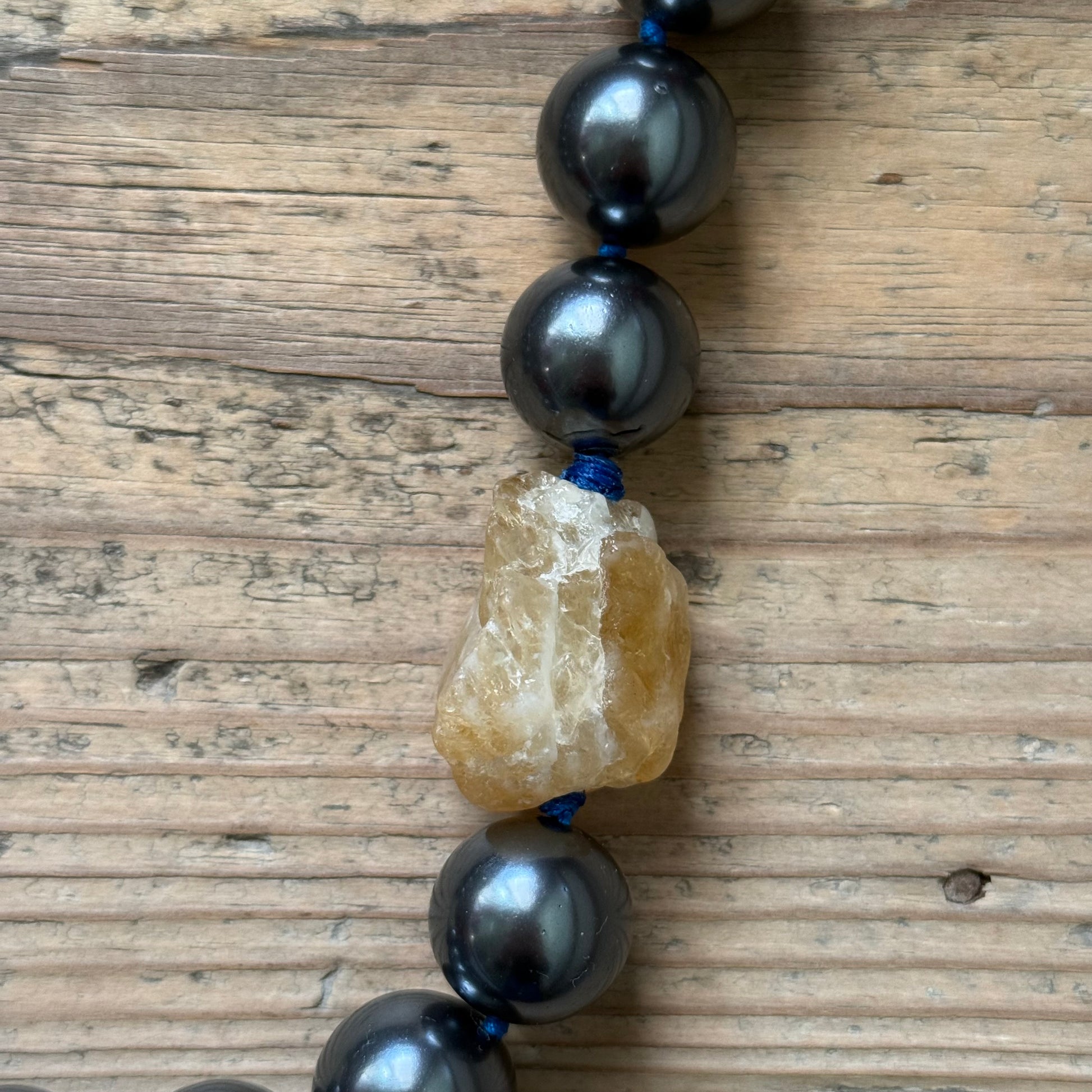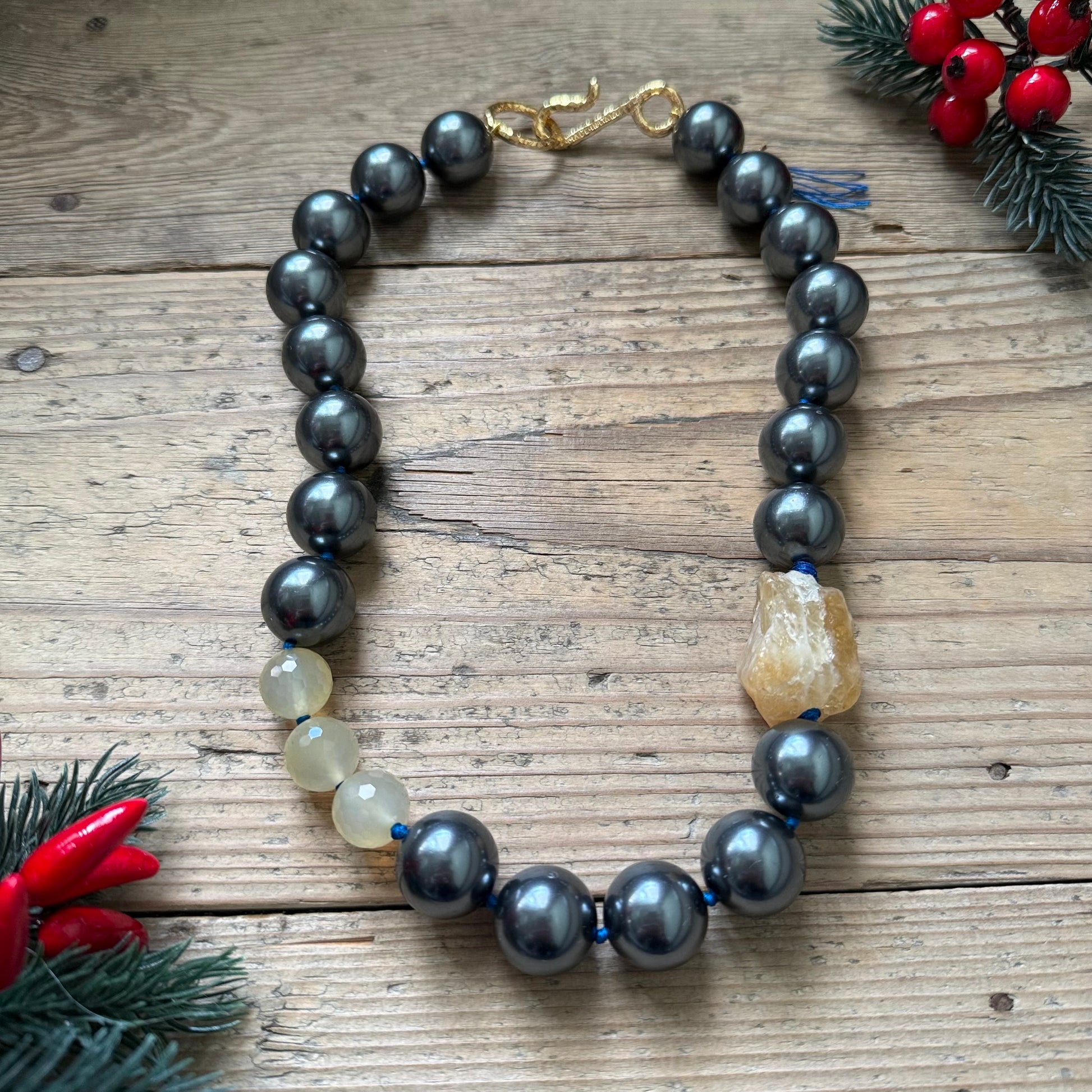Choker necklace featuring large synthetic pearls with a shell core, a large raw citrine crystal, and faceted light yellow jade spheres. Gold-plated brass clasp and electric blue knots.