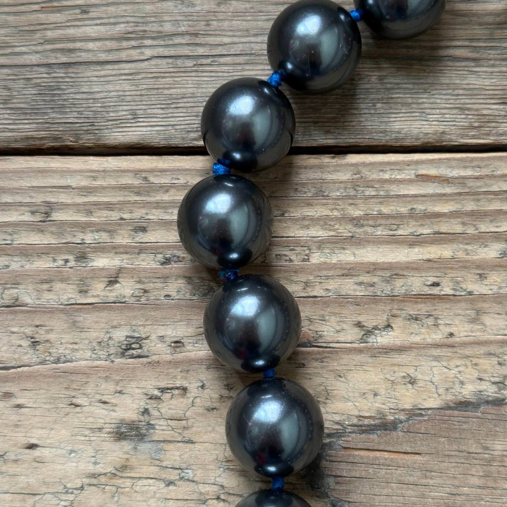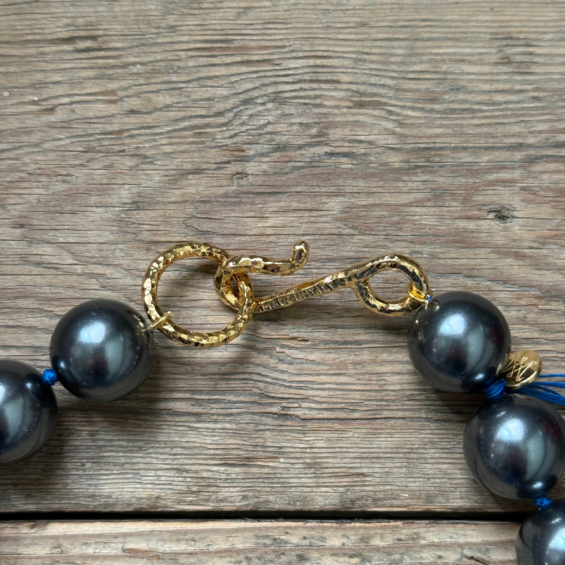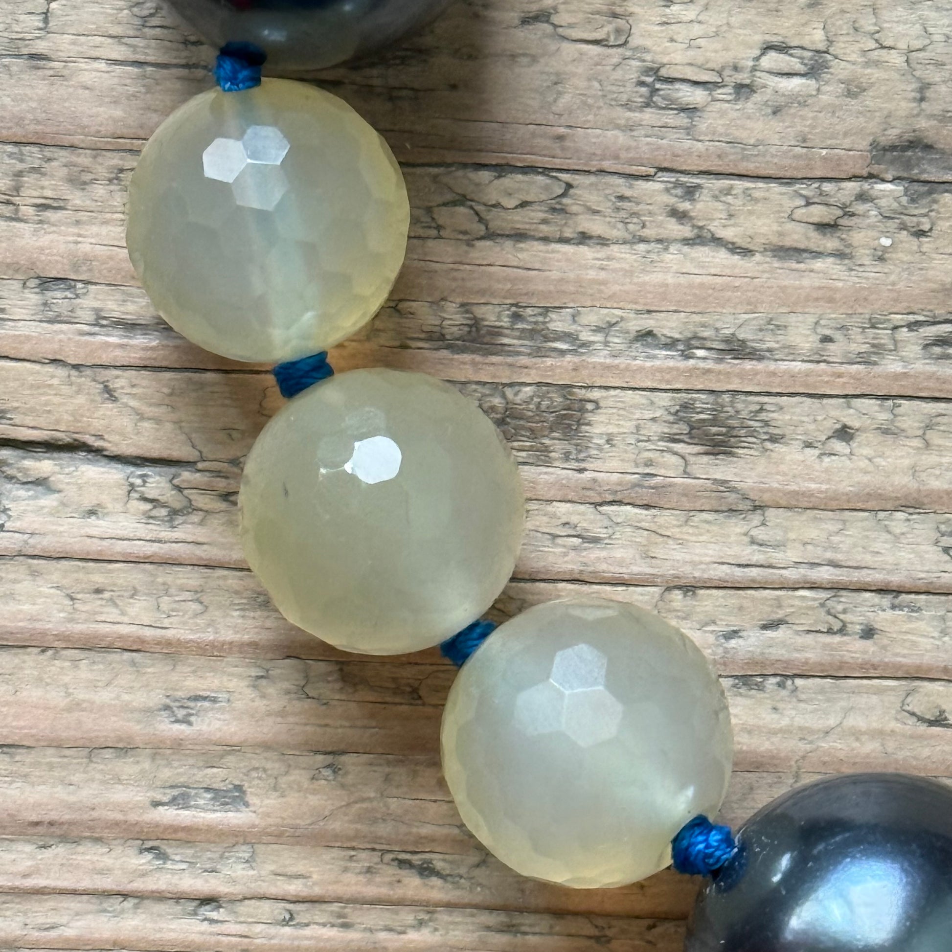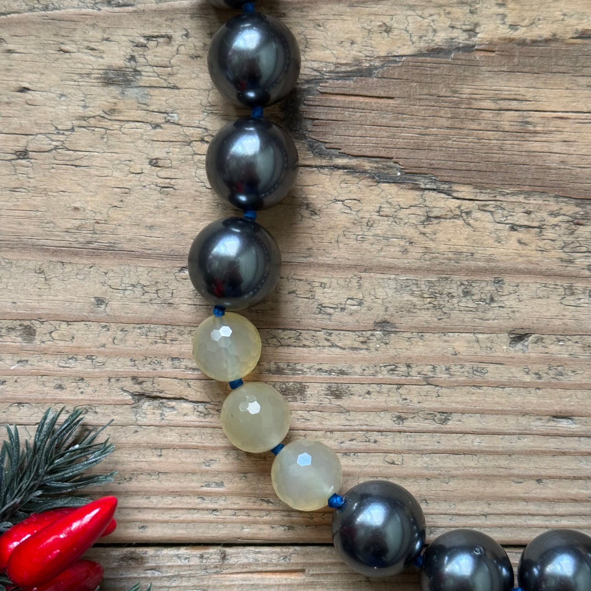 Choker necklace featuring large synthetic pearls with a shell core, a large raw citrine crystal, and faceted light yellow jade spheres. Gold-plated brass clasp and electric blue knots.